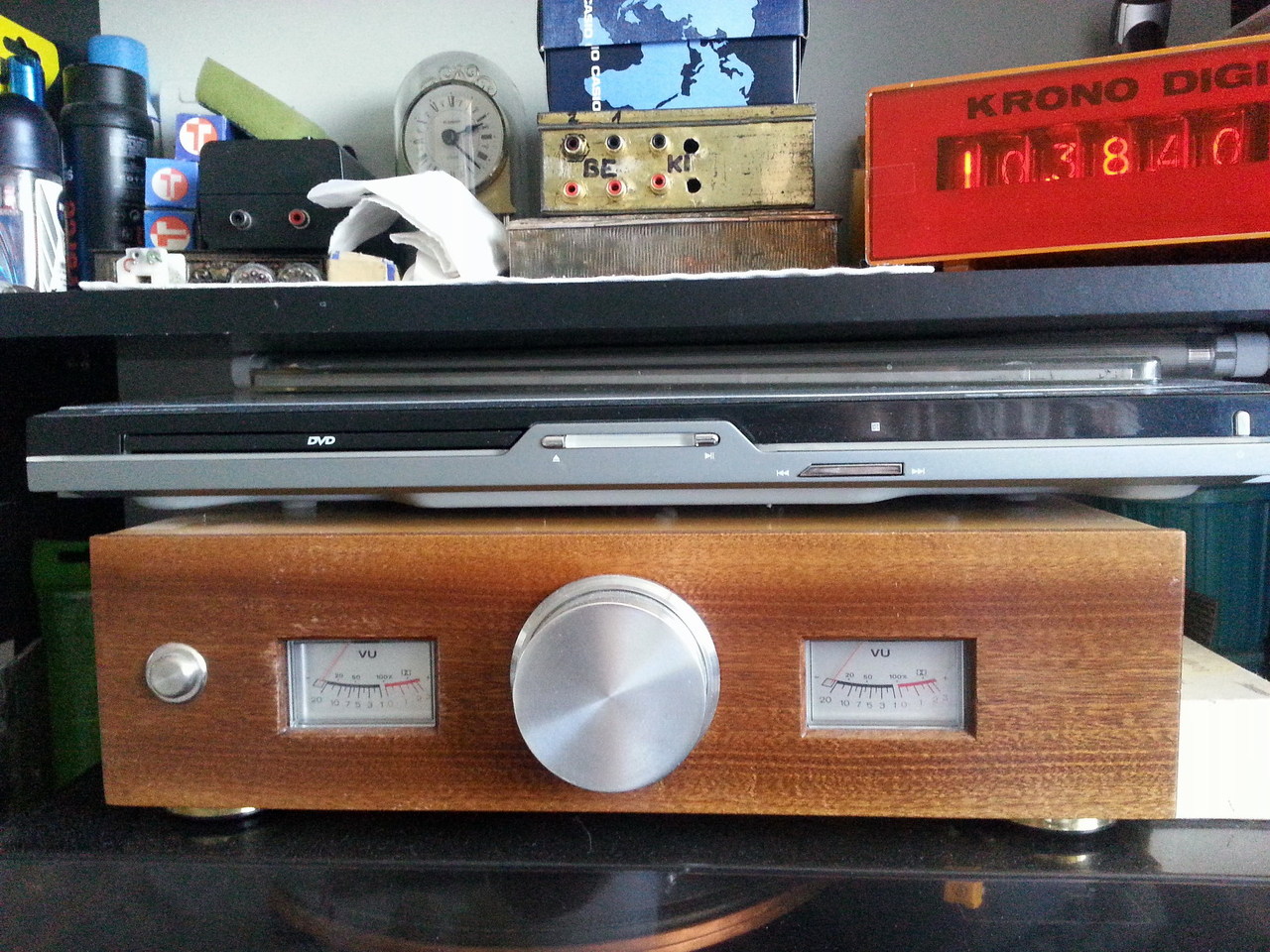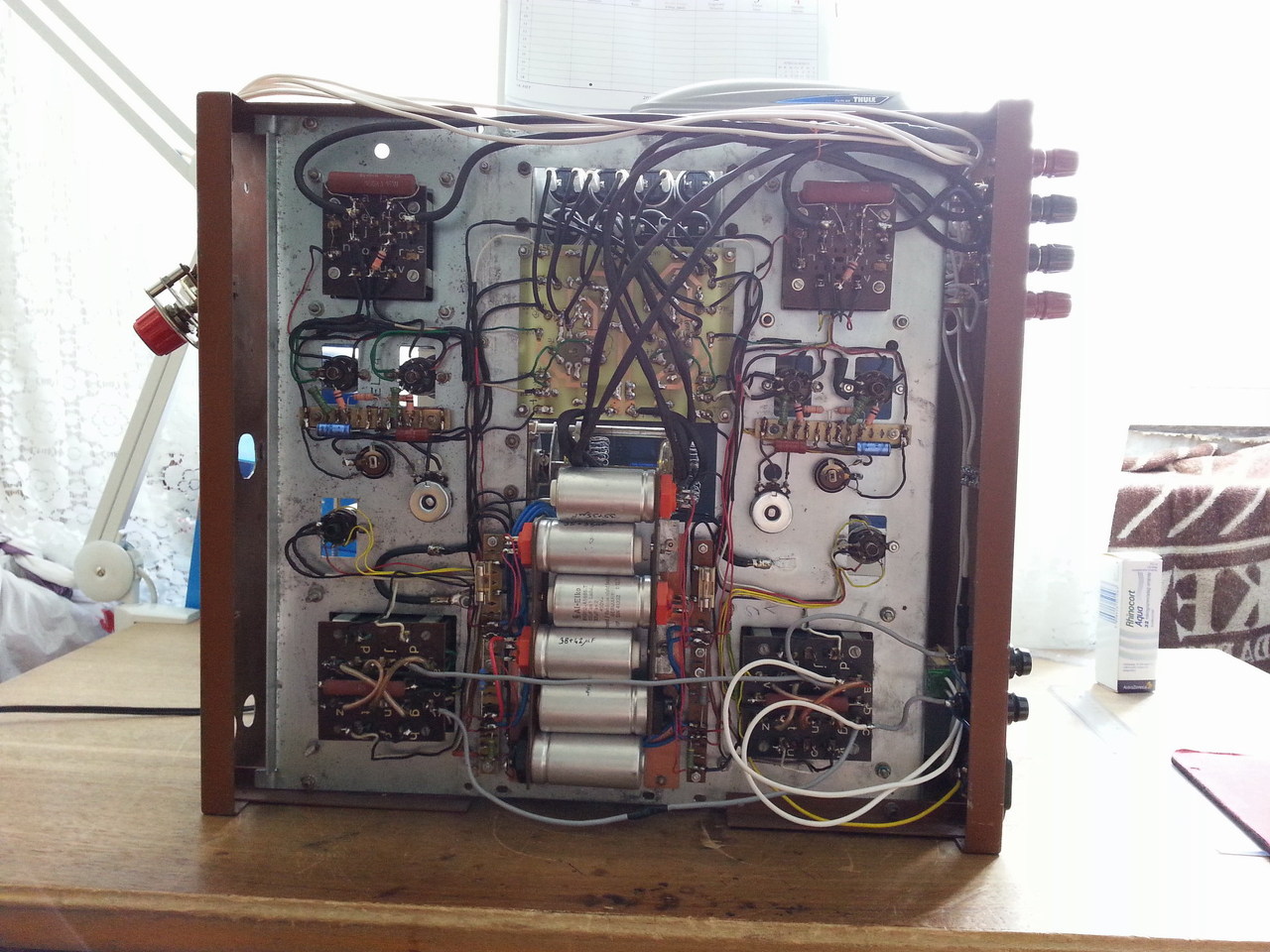 Igen arra gondoltam, de akkor ezek szerint még nem fejezted be. Azt tudom, hogy mennyi meló bedobozolni egy erősítőt, pláne egy egyedi dobozba. Legalább háromszor annyi meló, mint elkészíteni az áramköröket. Nagyon tetszik a Tenor formaterve, én is valami szép dobozon gondolkodom. Már száz éve kész van a sasszin a csöves erősítőm, de nem akar valahogy kialakulni a formaterv. Szeretném én is valami ilyen nívós dobozba beépíteni, hogy ne olyan lepattant külseje legyen, mint most. Illetve nincs is külseje, mert a sasszira csak egy BEAG erősítőnek az elő- és hátlapja van egy-egy csavarral felerősítve tartókeret gyanánt. Így fest jelenleg.