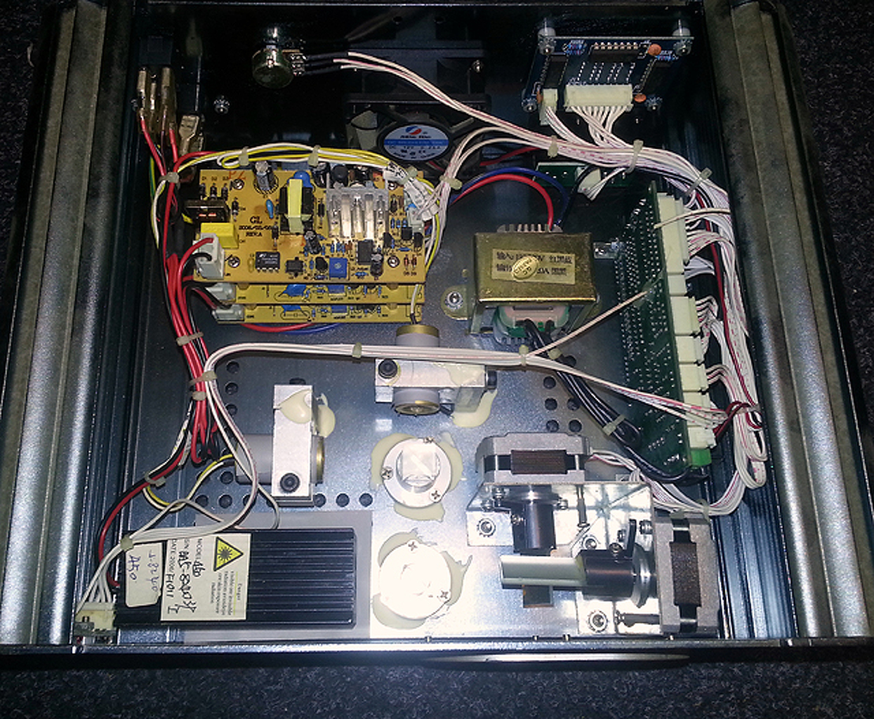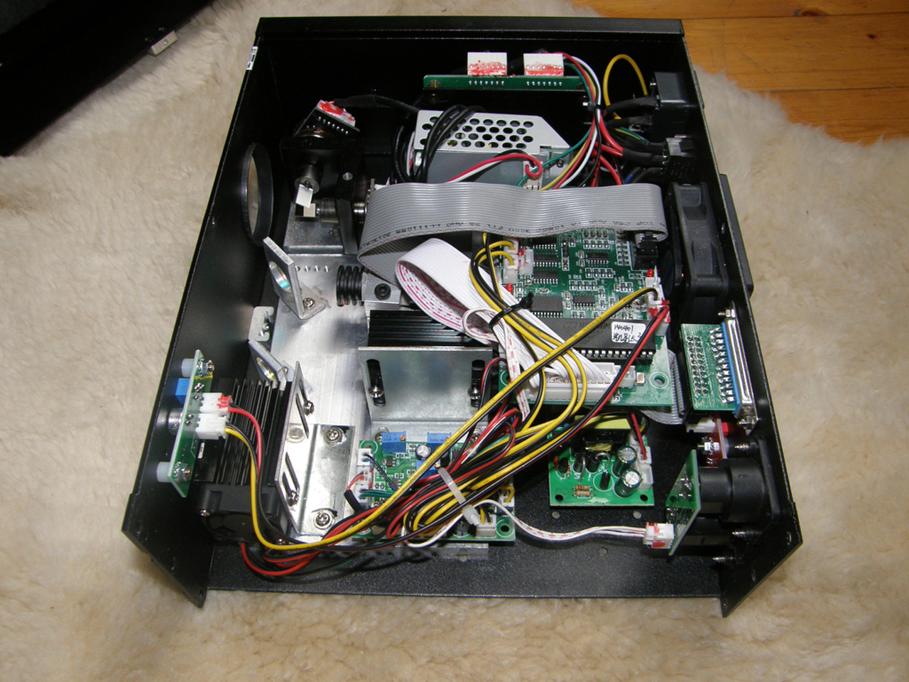 Sziasztok. Itt egy saját készitésű rgb lézer, piaci laser pointerekkel és a galvót 2db oral-b elektromos fogkefe helyettesiti, vezérlésük egyszerű feszültségszabályzás.