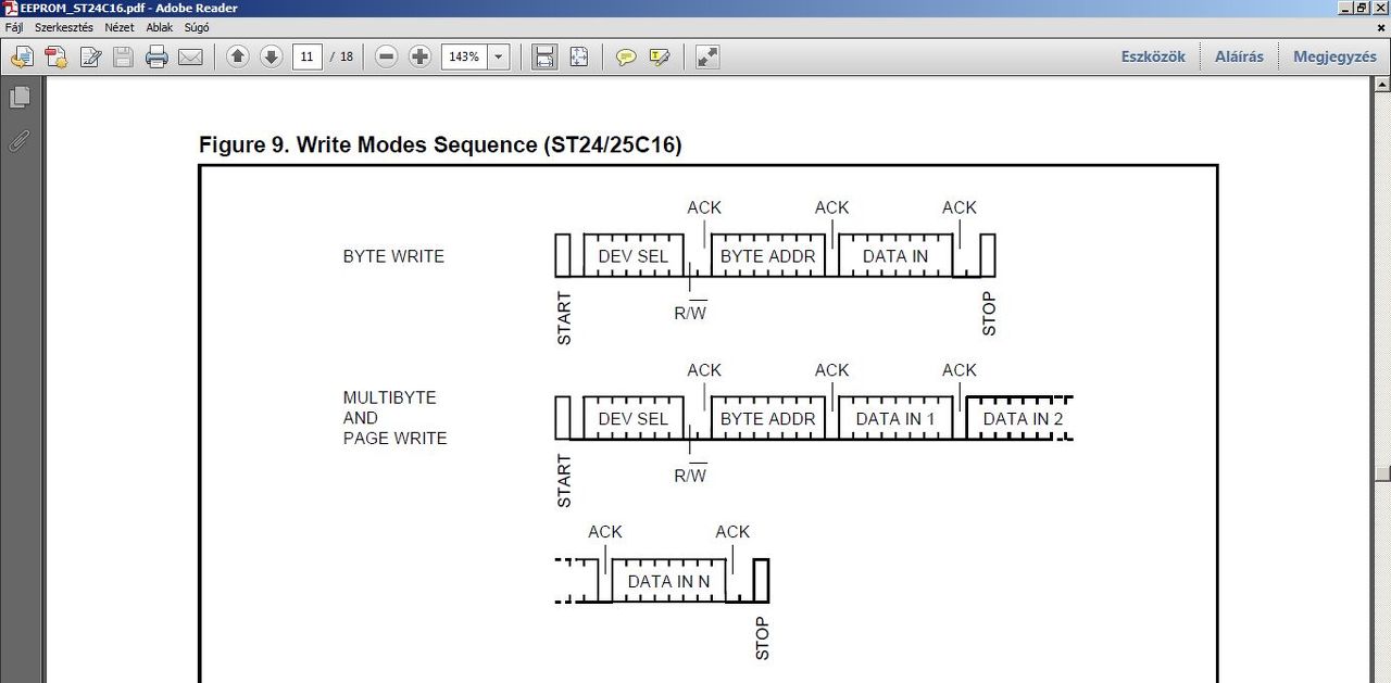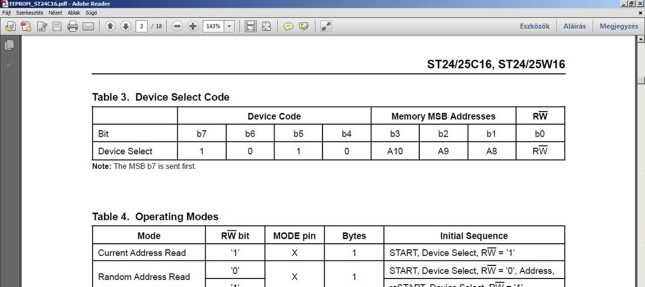 Ennek egyszersmind az a következménye, hogy a 24C04 cím bájtja 1010AACR formátumú. Ahol R az írást vagy olvasást jelenti, C-ben van a 9. címbit, mert ugye 512 byte (4kbit) címzéséhez már 9 bit kell. 1010 meg a memóriaeszköz alap címe. AA-n meg beállítható egy saját cím, amivel így 4 chip közül lehet választani. Na most 24C08 esetében 1010ACCR a formátum, hiszen itt már 10 bites a címbusz, de még mindig marad egy bit az eszköz kiválasztására. 24c16 esetében vége a dalnak, ott 11 bites cím miatt nincsen lehetőség a chip egyedi címének beállítására. A chip adott lába pedig, (hogy ne maradjanak kihasználatlanul) Vdd-re kötve protected módba állítják a megfelelő memórialapot. olyan 24CXX esetében ahol XX>16 a három bit már egyébként sem lenne elég, ezért ott az a három bit megint csak használható a chip megcímzésére (így egyetlen I2C buszon 2^3 db ilyen eszköz használható) a memória címzést meg úgy oldották meg, hogy külön byte-ban el kell küldeni a cím felső bitjeit. A PCF8583 egyetlen bitet tart fent az eszköz kiválasztásra. De az is a legalsó. A cím byte itt: 1010xxCR formájú. Olyan 24CXX-el lehet tehet csak egy buszon használni, amelyik címbusza maximum 8 bites (24C02, 24C01) vagy amelyik címbusza több mint 11 bites. 24C32 stb. Kivettem a PCF8583 mellől a 24C16-ot. Szerencsére tokot forrasztottam be. Persze mindennek akkor kellett volna utána néznem mikor...most már mindegy. ![]() Viszont a PCF8583 óra chippel is gondom van, de azt egy másik bejegyzésbe... Minden esetre kösz a válaszodat, és kösz, hogy foglalkoztál a dologgal. Nekem ST-s chipem van. Az tuti így működik és a Microchip-es is. Az AT-nál nem tudom mi a helyzet. L. A hozzászólás módosítva: Aug 30, 2014