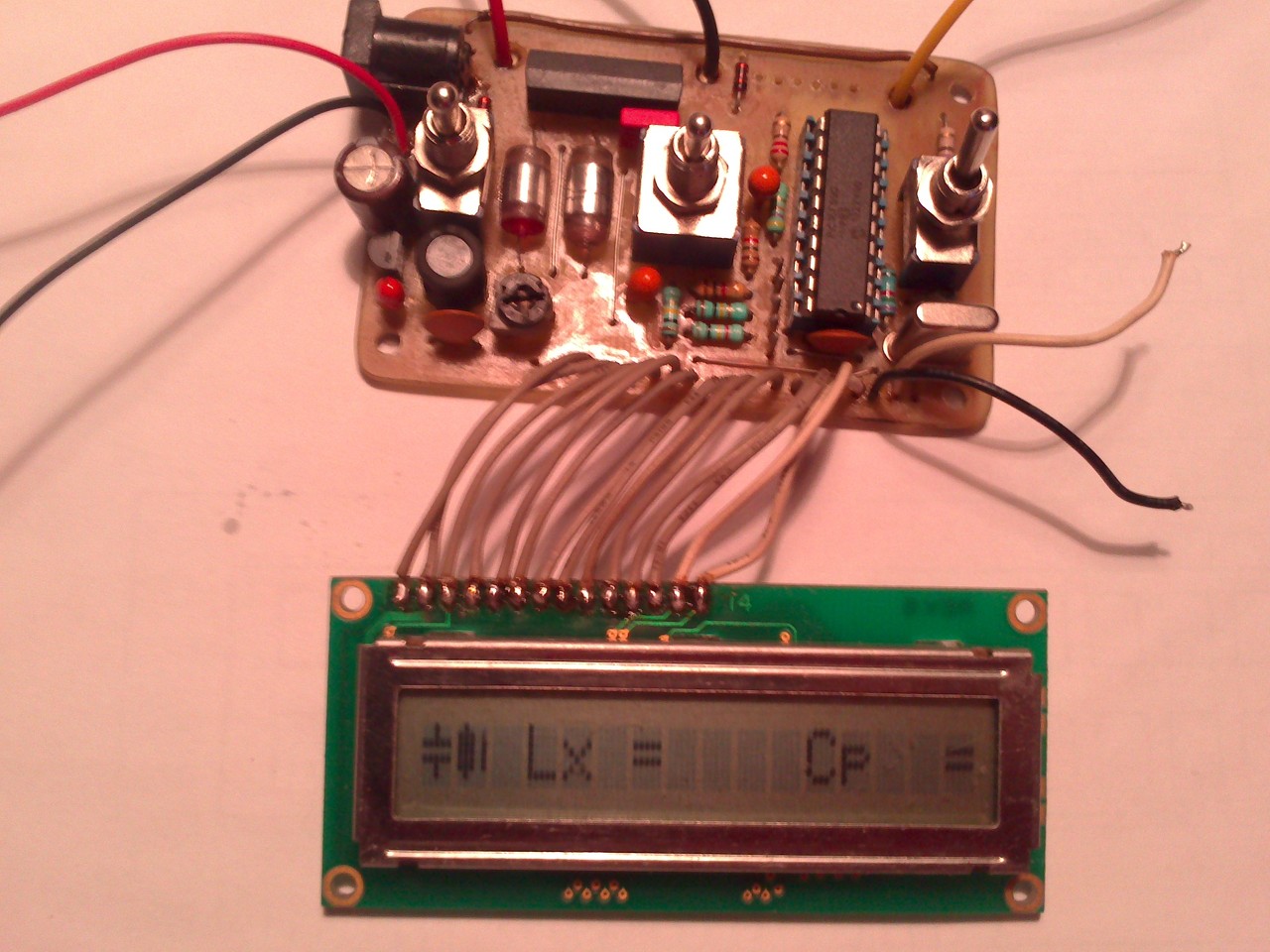 Na rá jöttem a hibára!, csak az volt amire tippeltem, az LCD kijelzőm nem kompatibilis az LCM3-mal. Volt itthon egy 14-lábas és egyszer 16-szegmenses LCD kijelzőm, és lás csodát a kijelző ki mutatott egy két dolgot ahogy a képen is látszik!. A kérdés már csak az volna hogy hogy tudnám azt meg csinálni hogy ez az LCD kijelző ami nem akar működni az LCM3-mal, hogy működjön?, vagy ahhoz hogy működjön egy új programot kellene írni hogy működjön a kijelzőmmel az LCM3?. Most már meg van a gond csak erre kéne egy jó megoldás. Aki tud azt kérem segítsen mert már közel a megoldás!. Köszönöm!.