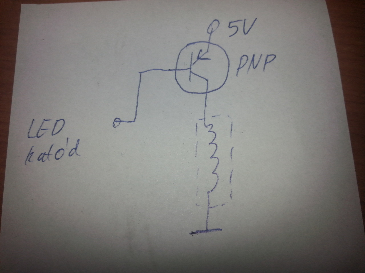 Fontos! Lemaradt, de a bázis és a led katódja közé tegyél egy 220ohmos ellenállást, mert anélkül nem nagyon bírná a tranyó.