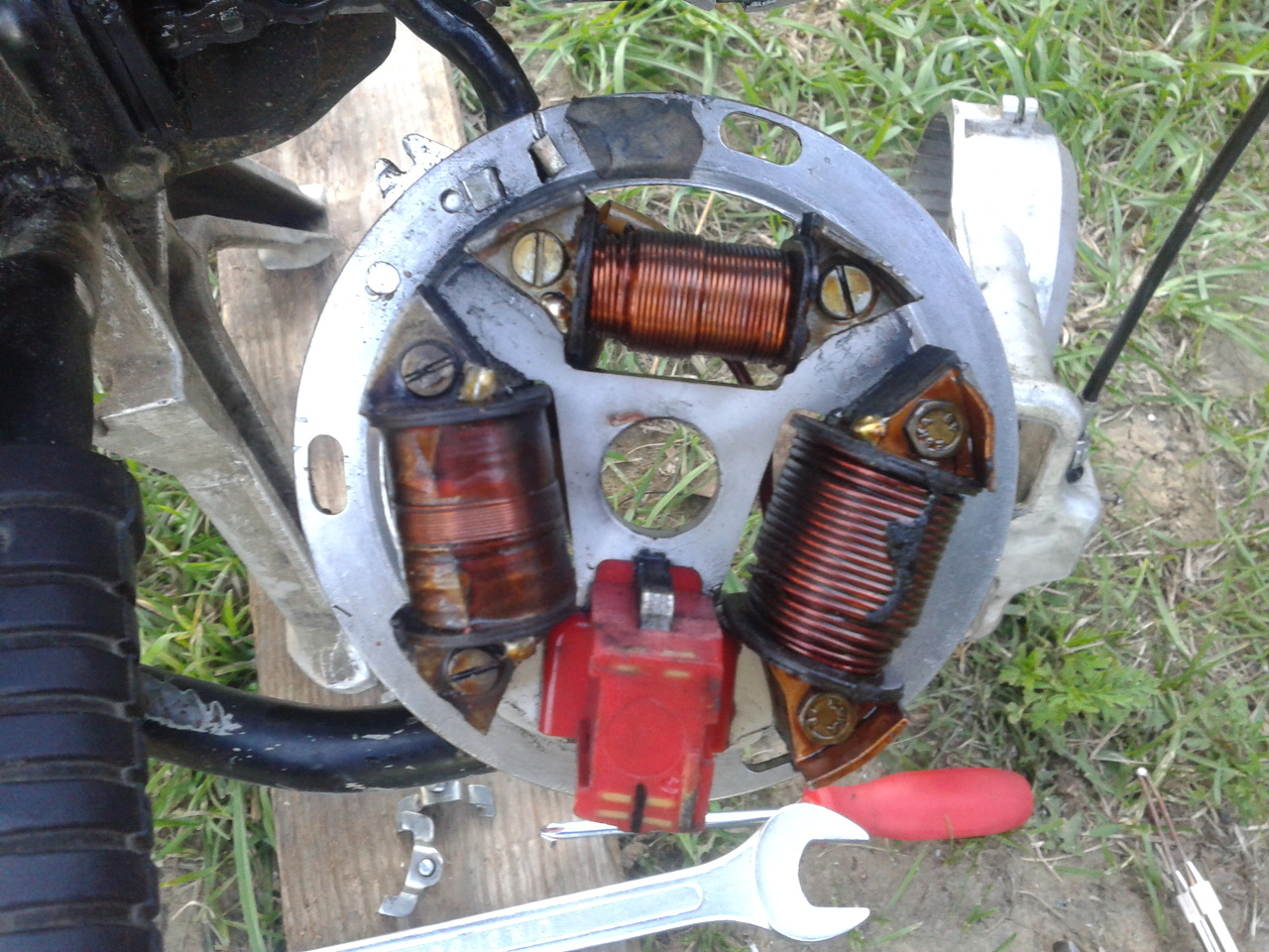 Próbából kösd a mérőt (piros-fekete) az akku sarkaira, akkor a váz, kábelezés, kapcsoló vezetési hibái ki lesznek zárva. A jelet pedig arról a tekercsről vedd amelyiken alapjáraton a legnagyobb AC feszültséget méred.