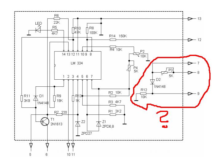 Ott van D2 (1N4148) meg a trimmer is (P3) és földre van huzva az R12-őn keresztül!!! Neked ennél a résznél csak a potit kell bekötni a rajz szerinti számozott kivezetésekre ami a nyákrajzon is jelölve van!!!Meg bekötöd még a másik kapcsolást is ami a kimenet meg berakod a graetzet meg a puffert és megy is a cucc!!!