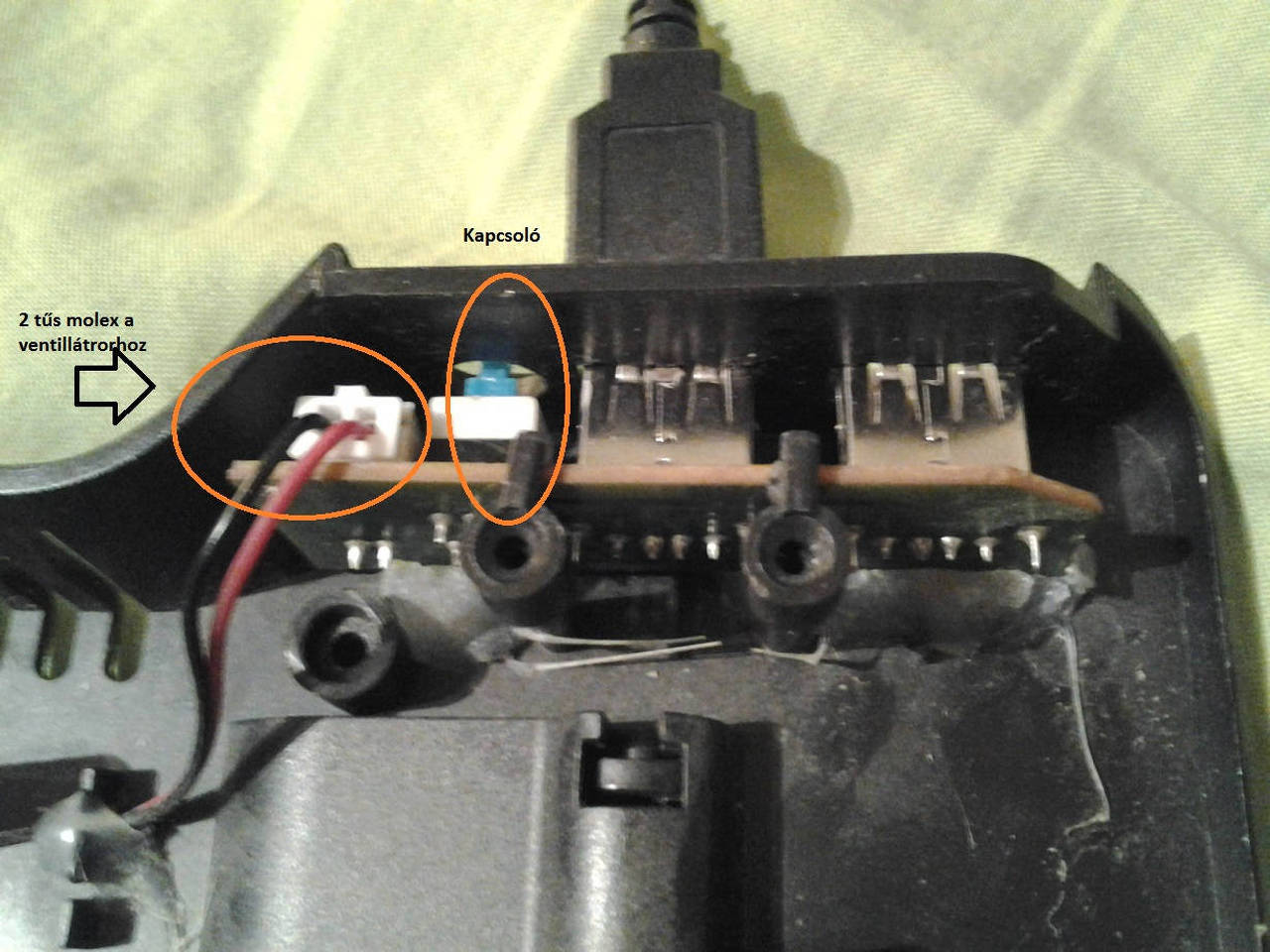 Egy notebook hűtőmnél tönkrement a bekapcsoló gombja vagy környékén valami. A ventillátornak, 2 tűs (2 pin) molex csatlakozója van, ami belemegy egy pici nyákba, abban van egy USB lány kimenet. Innen lehet a notebookot összekötni egy normál USB A - USB A kábellel. A nyákon van egy ki bekapcsoló, vagy ez ment tönkre, vagy a nyákon valami. A nyákon 2db USB lány foglalat van. Tehát egy USB pluszban, amit a notebook elvisz a ventihez, itt "vissza adja". Szeretném direktben bekötni a molex csatlakozót az USB-re, de nem értek hozzá még hobbi szinten sem. Kérdés: Ha simán összekötném a molex piros - fekete kábeleit az USB-vel, az működhetne? Vagy az a nyák nem viccből volt ott? Esetleg csak a kapcsoló és a plusz USB miatt? Csatoltam egy képet. Ha elvágom az USB kábelt, össze lehet direktben kötni a molexet az USB-vel? Nem gyullad ki?