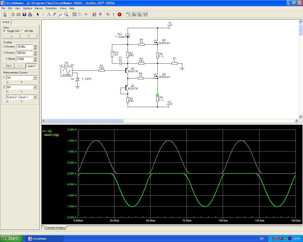 Ezt a fetmeghajtós dolgot, hogy nem is kell nagy áram szimulációnál megfigyeltem. Ha normál CD jellel vezérlem ki, valóban nem lesz akkora gate áram mint amiről a szakirodalom beszél. Tehát még a Baji fetest sem tudtam kihozni a sodrából a szimulációk során. Úgy véltem, elég magas frekvencián egyszerűen elfogy a meghajtó árama, és a szinuszból háromszög lesz, előidézve a torzítást. De nem. Ebből azt vontam le, hogy nem ez az oka a sokak által kásásnak, fémesnek jelzett fetes hangzásnak. Ez a torzítás máshol keresendő, de a gate kapacitás mint probléma szerepet játszik benne.