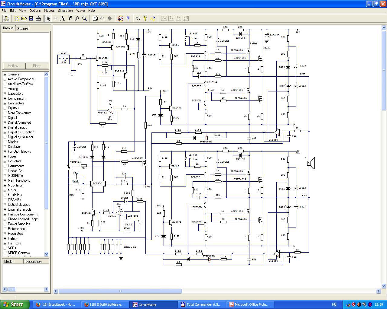 És ami miatt ezt felemlegettem... mi a fene lehet ezekben az erősítőkben? Milyen lehet a kapcsolástechnikájuk? Milyen alkatrészekből építkeznek? Ezek nincsenek fent a neten és a gyártójukon kívül senki nem ismeri őket. Az biztos, hogy mocsok jól szólnak. Az is biztos, hogy ha ezekre gondolok nagyon kis pontnak érzem magam mellettük. És az is majdnem biztos, hogy amely kapcsolásokat mi a neten találunk, azoknak nincs köze ezekhez az erősítőkhöz. Persze ki tudja? Meg ott van még a d'Agostino, aki a Krell fejlesztője volt és alapított önálló céget. Na, abba is érdemes belenézni. Dugig van alkatrésszel. De az is lehet, hogy csak ezek csak védelmek és egyéb kiegészítő áramkörök, mert mégse lehet húsz milláért nyolc tranzisztort eladni. Szóval, nekünk marad a "diyerkedés" és a kísérletezés. Azt az alapelvet azonban szem előtt kell tartani amit "katt-tól" tanultam. Ami belemegy, az jöjjön ki. Tehát az ideális végfok nulla torzítású, végtelen sávszélességű, nulla kimeneti ellenállású. Ezt a célt kell megközelíteni annyira, amennyire csak lehetséges. Emellett még előre meg kell határozni a szükséges kimeneti teljesítményt. Ezt most önkényesen eldöntöm ehhez a konkrét végfokhoz. 100 W/4 Ohm. Ez úgy jön ki, hogy a hangdobozom 4 Ohm-os, a félhullámú 120 W-os és ha bömböltetni akarom, akkor elég itthonra ez a 100 W. Amúgy háttérzeneként 0.5 W-tal szoktam hallgatni, ha meg leülök zenét hallgatni, vagy tesztelni, akkor 6-8 dB-el hangosabban, tehát úgy 2-5 W körül.