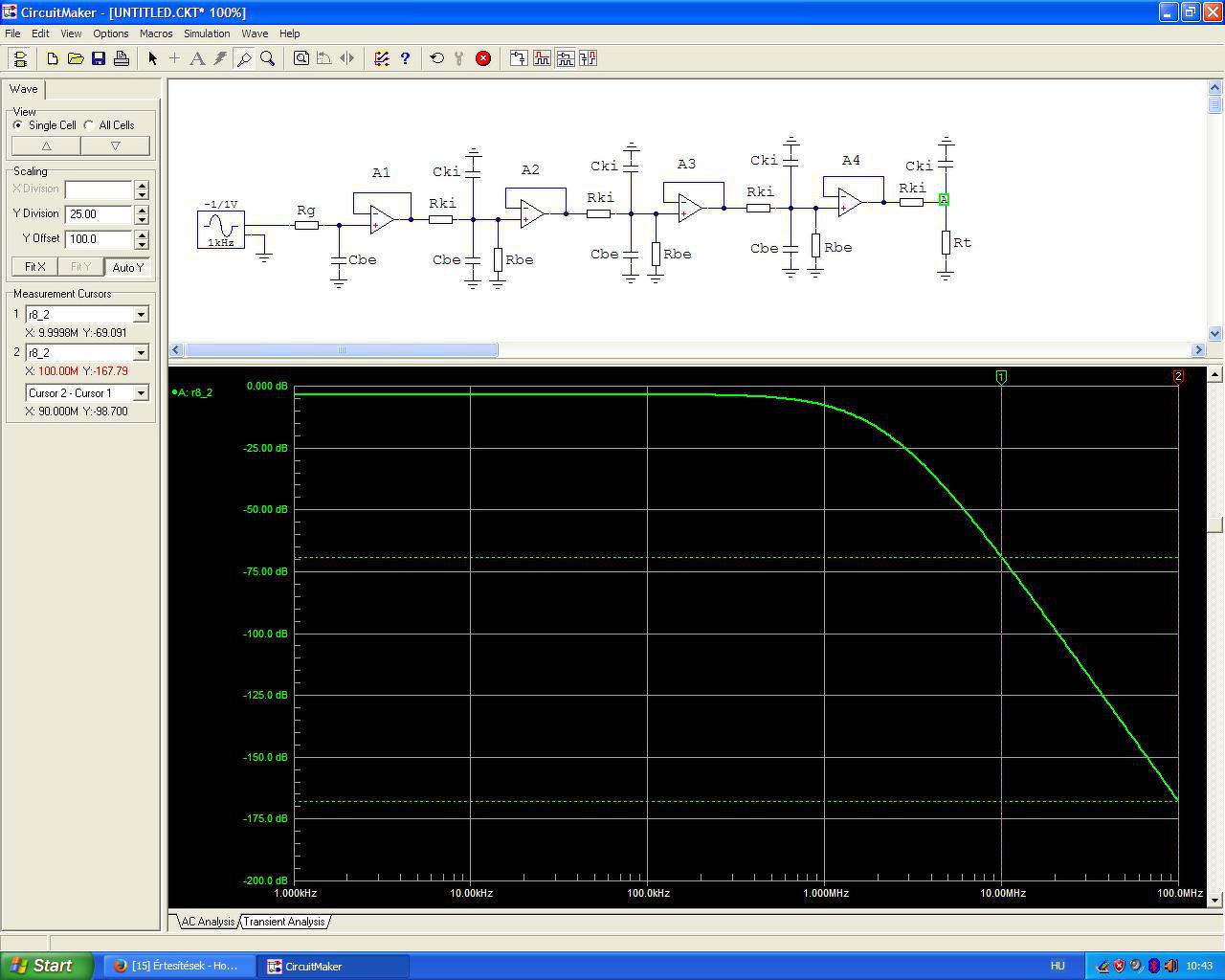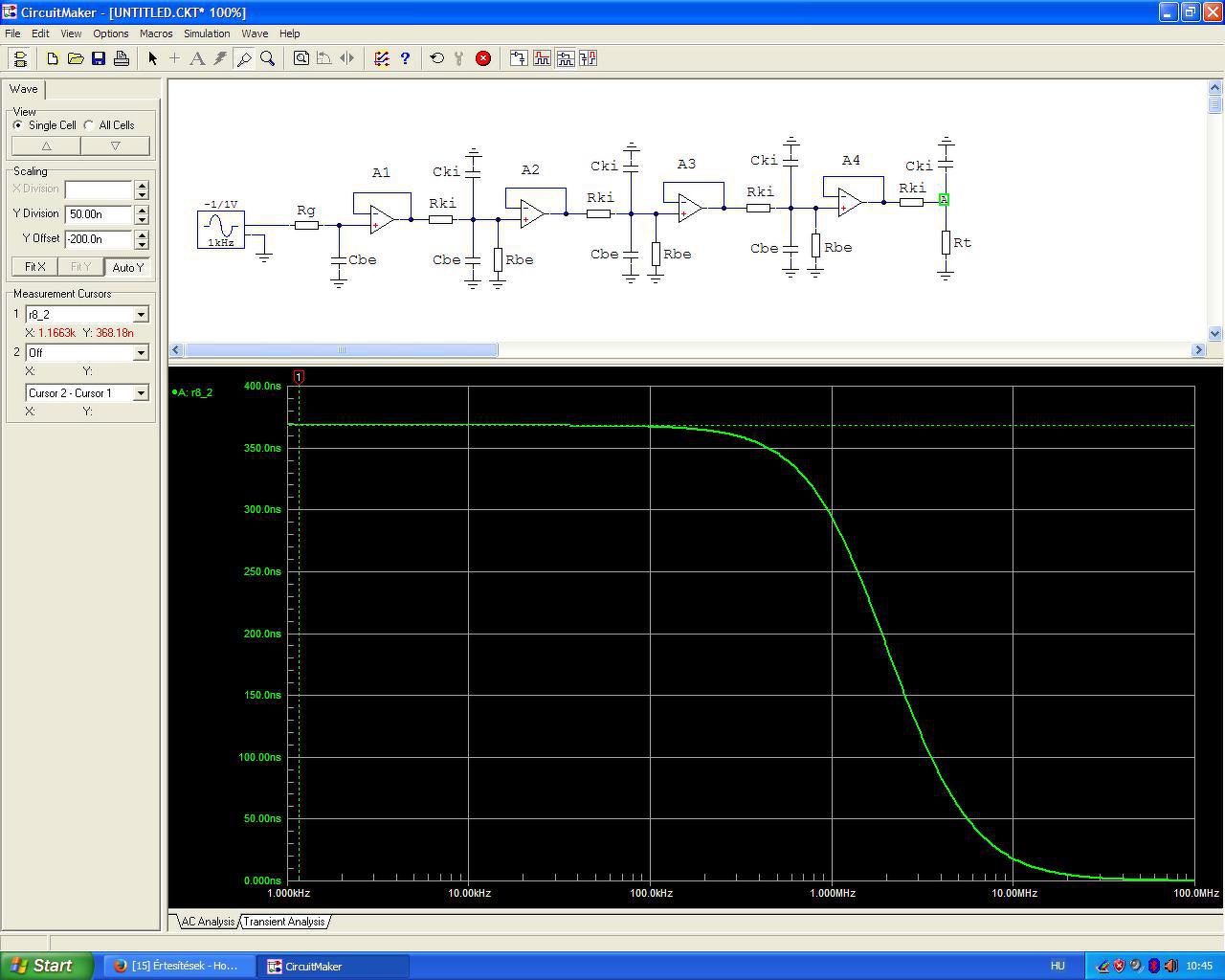 Minden "háromszög" rendelkezik a "szokásos" tulajdonságokkal: - nemlineáris (eltorzítja a jelet, most mindegy hogyan) - offset drift (keletkezik benne DC szint eltolódás, tehát a kimeneten soha nincs 0V) - termikus torzítás (a kivezérlés és az idő függvényében is változik a fokozatok erősítése) - van ki- és bemeneti ellenállása - van ki- és bemeneti kapacitása és ez a két utóbbi tulajdonsága is változik a kivezérlés mértékével, az idővel és mindennel - a sok berajzolt RC tagból azonnal szembeötlik, hogy ez egy sokadrendű aluláteresztő - ebből meg az következik, hogy van késleltetése és van csoportfutási ideje is Most az a kérdés, hogy a késleltetés és a csoportfutási idő hogyan függ össze egymással. Egyáltalán két különböző dologról beszélünk, vagy pedig ugyan arról?