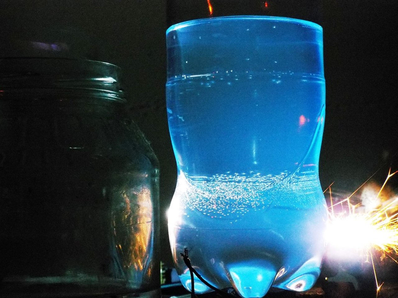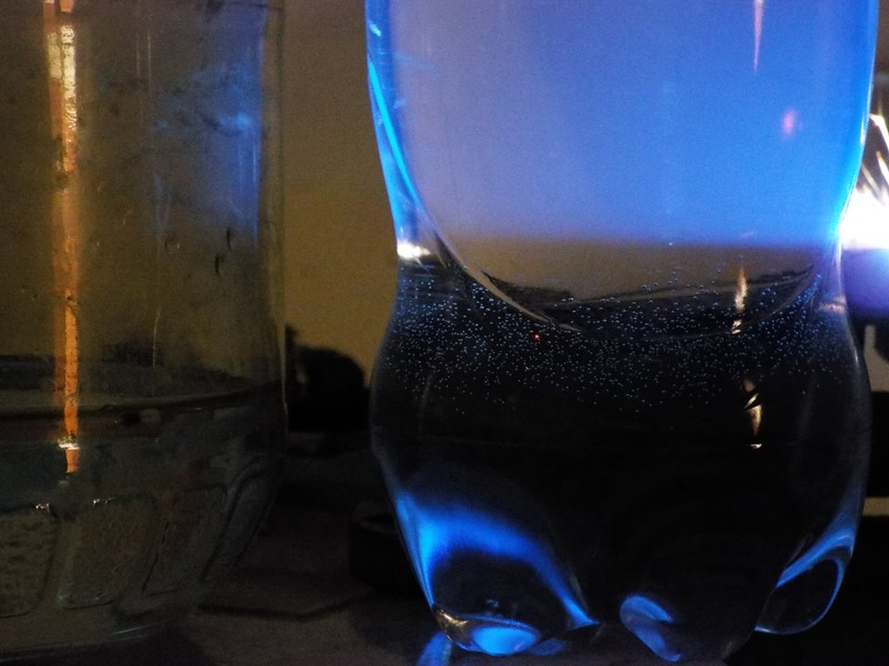Újabb kísérlet, ezúttal most nem "atomcucc", hanem sima UV, és a jól ismert keserű ital, a tonik. Nem is gondoltam, hogy a sima mezei szikrázáskor ennyi UV keletkezik. (Most már tuti, hogy a díszatomreaktoromban UV LED lesz, és tonikkal töltöm fel. Így olyan lesz, mint Cserenkov effektus.)