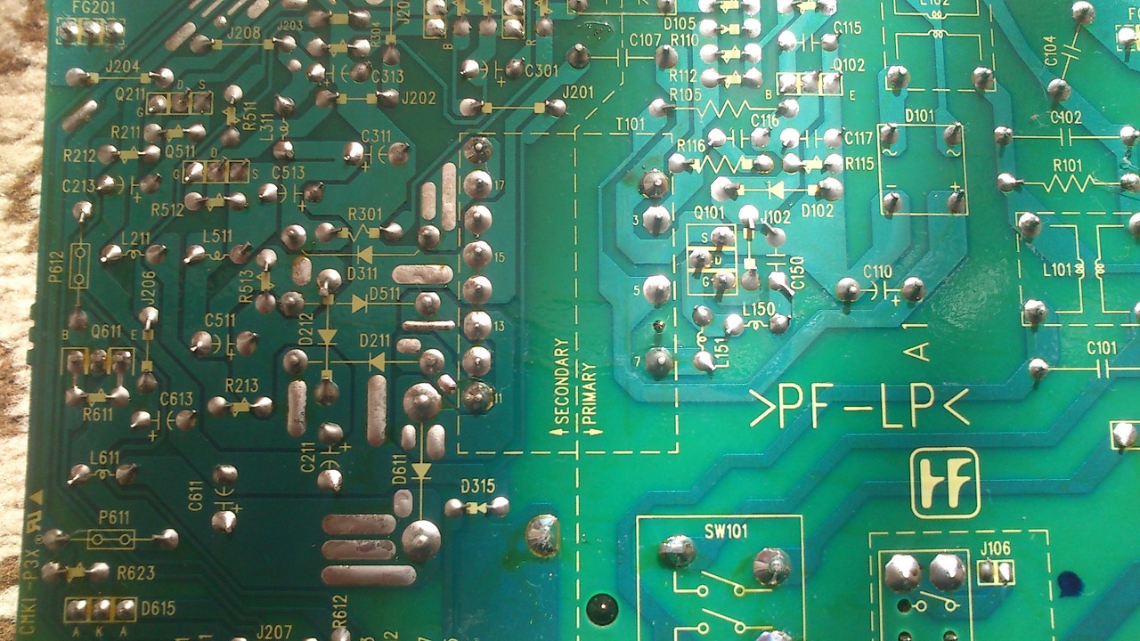 Amennyit most látok: Tényleg komolyabb táp. A szekunder oldali alkatrészek 60%-a kivehető. Ami viszont zavarba ejt: a transzformátor kivezetéseinek száma valahogyan nem stimmel. Nézzétek csak meg a primer oldalt. A beültetési rajzon 3 kivezetés van, a kapcsolási rajzon pedig 4 kivezetés van a primer oldalon.