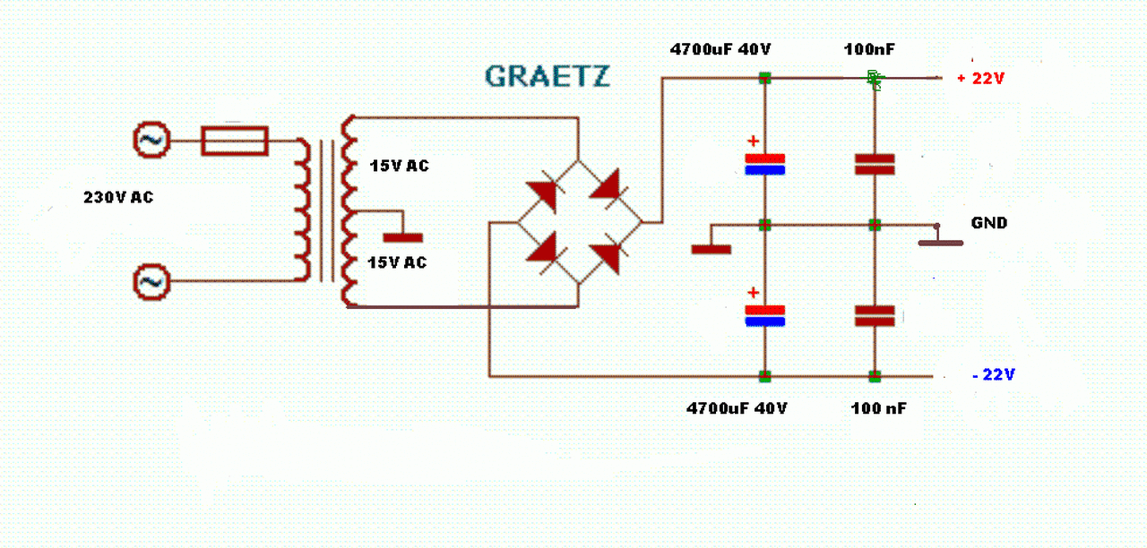 Egy példa : Ha a trafód szekunder tekercsei 12,5 V és 12,5 V 2A leadása mellet, akkor 2A x(12,5V+12,5V) = 50 W. Egyen irányítás után , a 10.000µF kondenzátoron mérve : 12,5Vx1,4=17,5V a leadott egyenfeszültség. Így a két kimenet : + 17,5V és -17,5V
