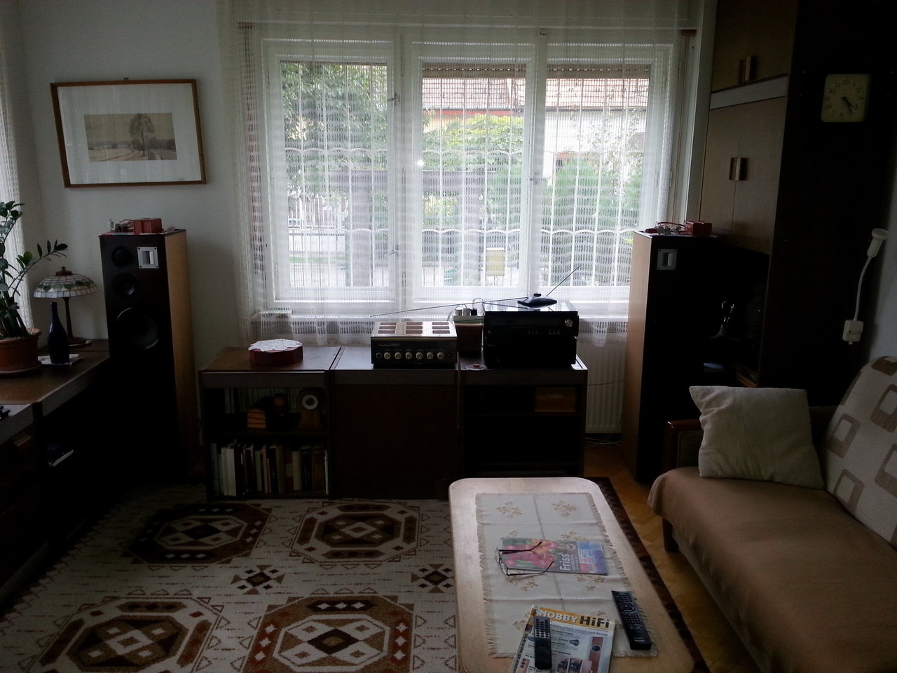Szeretném Nektek bemutatni a legújabb alkotásomat, egy Scan Speak és Fostex hangszórókból álló Transmission Line hangsugárzó rendszert. A teljes hangszórókészlet ALNICO mágnessel szerelt, benne van az anyag. A doboz lécbetétes bútorlap bükk furnérozással. Az elején lévő front lap rétegelt lemez, ez takarja el az illesztéseket. Ez a frontlap 2 réteg sötétbarna vastaglazúrt kapott, az oldala és a háta nitrolakk bevonatú, és natúr színű. Ezt a két színű designt találtam ki, mostanában sok cég gyárt hasonló kivitelű hangdobozokat. A képek sajnos egy kicsit sötétre sikerültek, mert sötét volt a szobában, ezért elnézéseteket kérem. Azért remélem valamennyire látszódnak. Életben sokkal szebb lett, a fénykép sajnos nem adja vissza teljesen a szépségét. A hangváltót még nem építettem be, hogy lehessen állítani rajta, most hogy a hangszórók bekerültek a végleges helyükre. Az eddigi meghallgatásokból ítélve nem kellett állítani rajta semmit sem. A mélysugárzó megkapja a teljes frekvenciasávot, de kb. 1,5-2kHz-nél befejezi a mondandóját, így nem került rá váltó. A középsugárzót nehéz volt illeszteni a rendszerbe, mert nagyon hangos volt a többihez képest, így kellett rá egy 5 Ohmból és egy 10 Ohmból álló feszültség osztó, és a közép szekció 20µF-os 6dB-s váltót kapott, és ezzel a beállítással kb. 1kHz-től indul. A magas szekció két részre van bontva, a dómsugárzó 1,5µF-os 6dB-s váltón keresztül megy, de nem megy fel elég magasra, ezért kellett még fölé egy Fostex ribbon magassugárzó, amely 1µF-os 6db-s váltót kapott. A hangja nagyon élethűre sikeredett, mondhatnám úgy is, hogy ez a hangsugárzó rendszer egy mérföldkő az életemben. El is neveztem Milestone-nak. A hozzászólás módosítva: Okt 2, 2014