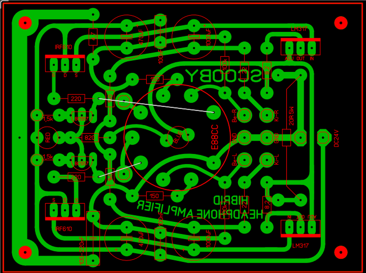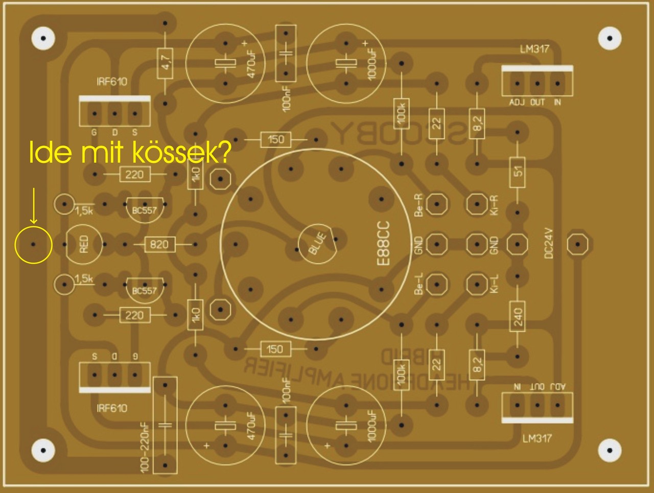 Szerk.: Nem tudom mennyire tiszta Neked, vagy mennyire figyelted a rajzot, viszont van két átkötés a NYÁK fólia oldalán sima szigetelt vezetékkel. Azok megvannak? A képen légkötéssel jelöltem őket. Az ECC82-t pedig 12V-ról fütsd! Ha be van kötve a cső 9-es lába, akkor azt valahogyan kösd ki. Az ECC82 eredetileg 2x6,3V-ról fűtene 4-9 illetve 5-9-es láb között. 6,3V-os fűtést alkalmazva ezt úgy oldják meg, hogy a 4 és 5-ös lábat összekötik, és az összekötött 4-5 és 9-es lábak közé kötik be a 6,3V-ot. A hozzászólás módosítva: Szept 30, 2014