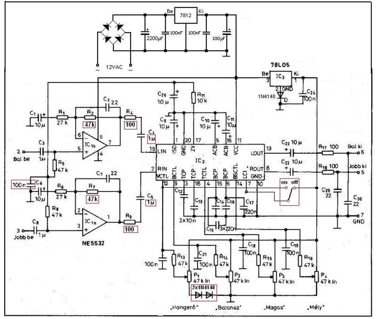 Megépítettem egy sztereó végfokot 1036-s hangszínszabályozóval. Az a gondom vele, hogy bekapcsolás után az egyik oldal egy ideig torzan és halkabban szól. A képen a pirossal megjelölt kondenzátor tetejét megérintve "brummot" kap. A másiknál csatornánál nem. A 1036-s 7812-ről kap táplálást. A torz csatorna egy idő után "rendbe jön". A hangsugárzókat megcseréltem, a hiba maradt azon az oldalon. Egyébként az erősítő hangja meglepett (már amikor üzemszerűen működik). Megköszönném a segítséget. A hozzászólás módosítva: Okt 5, 2014