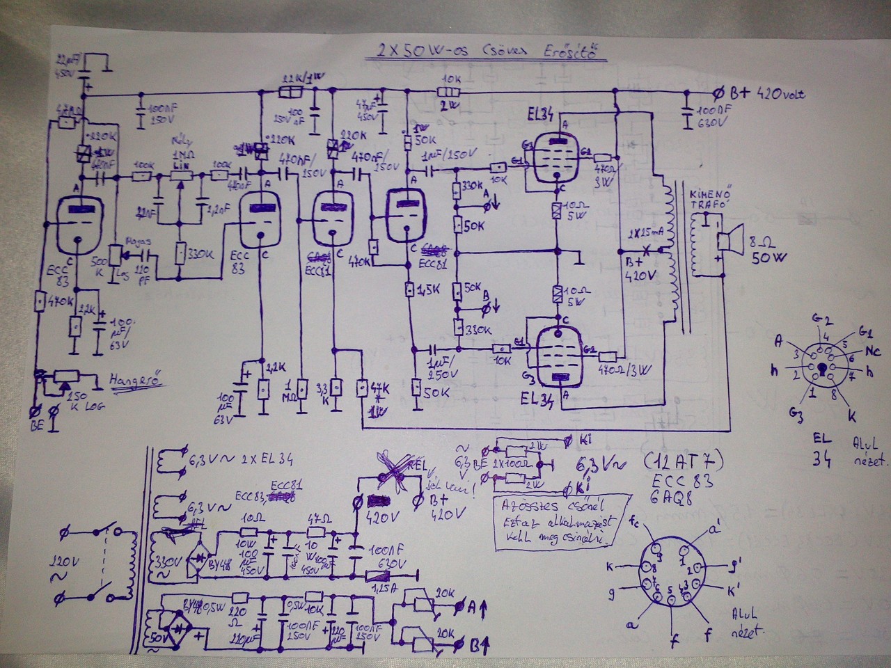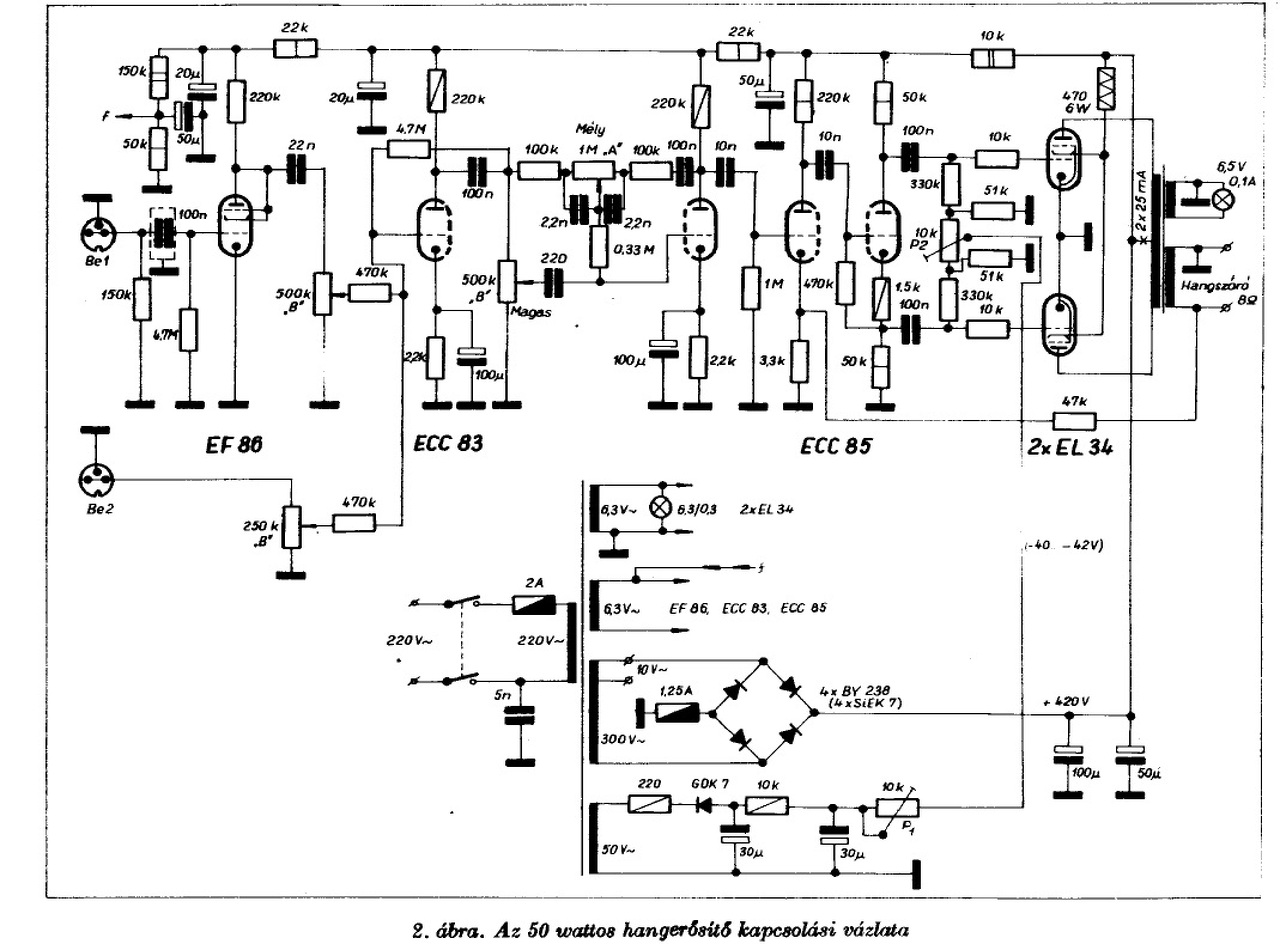 Meg szeretném ennek az 50W-os erősítőnek a hálózati transzformátorját tekercselni, csak az 50V-os résznek nem tudom hogy milyen vastagságú drótot válasszak? A transzformátor 400w-os E+I vasmagos. A 230V-os résznek 0,7mm-es drótot ajánl a rajz, a 330V-os résznek 0,6mm-es drótot. az EL34-es csöveknek a fűtő feszültséghez 1,5mm-es drótot, és az ECC83-asnak, és az ECC81(12AT7)-eseknek pedig 1mm-es vastagságú drótot. A fűtő fezültségékből 4 darab tekercset fogok fel tekerni a trafóra 2x1mm-es drótból 6,3V-ot, és 2x1,5mm-es drótból 6,3V-ot. A 330V-ot is kétszer tekerem fel a trafóra külön külön, és az 50V-os részt is ugyan így akarom fel tekerni!, Csak azt nem tudom hogy az 50V-os részt milyen dróttal tekerjem meg?, ebben ha segítene valaki az jó volna, mondjuk én 0,6-os drótra gondoltam, de majd ezt ti meg mondátok pontosabban. Még egy kérdés, a 330v-os résznek hány amperes dióda hidat válasszak?, és ugyan úgy az 50V-os résznek is kíváncsi volnék hogy hány amperes dióda híd volna elegendő?. Fel teszem a rajzot is, hogy lássátok miről is van szó. CIROKL fórumtársunk át alakított egy régi rajzot nekem hogy jobban be lehessen állítani, mivel ez lesz az első komolyabb csöves erősítőm, és szeretném hogy tökéletes legyen, és jól szóljon! A hozzászólás módosítva: Okt 7, 2014