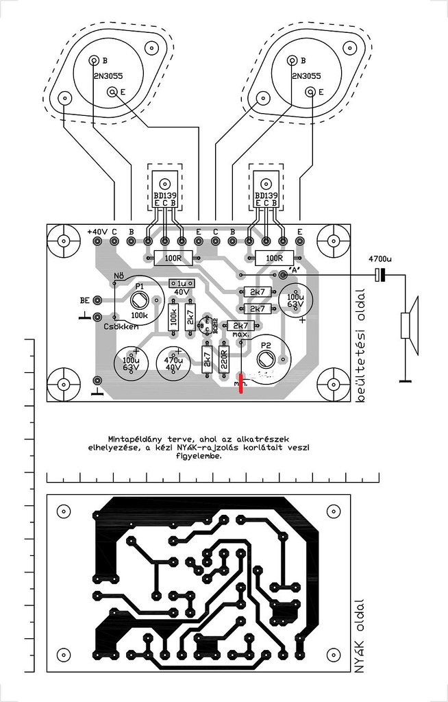 A táp nélküli, azaz a két 2N3055-össel szerelt NYÁK.