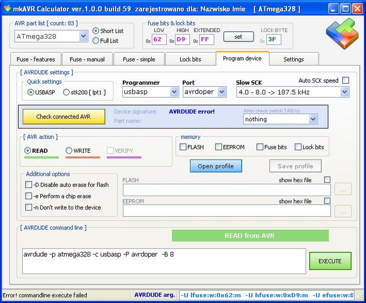 Az AVRDoper működését tüstént letudod , ellenőrizni ,hogy a szoftverből a read opciót kiválasztod .Ekindítod a folyamatot , és hiba nélkül lefut a művelet . Ezt a legalsó ablakban fogd látni .Bármilyen error hiba üzenet , vagy komunikációs hiba azt fogja mutatni , hogy még nem ok valami.