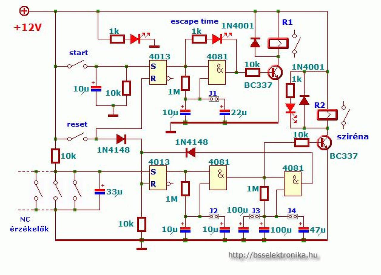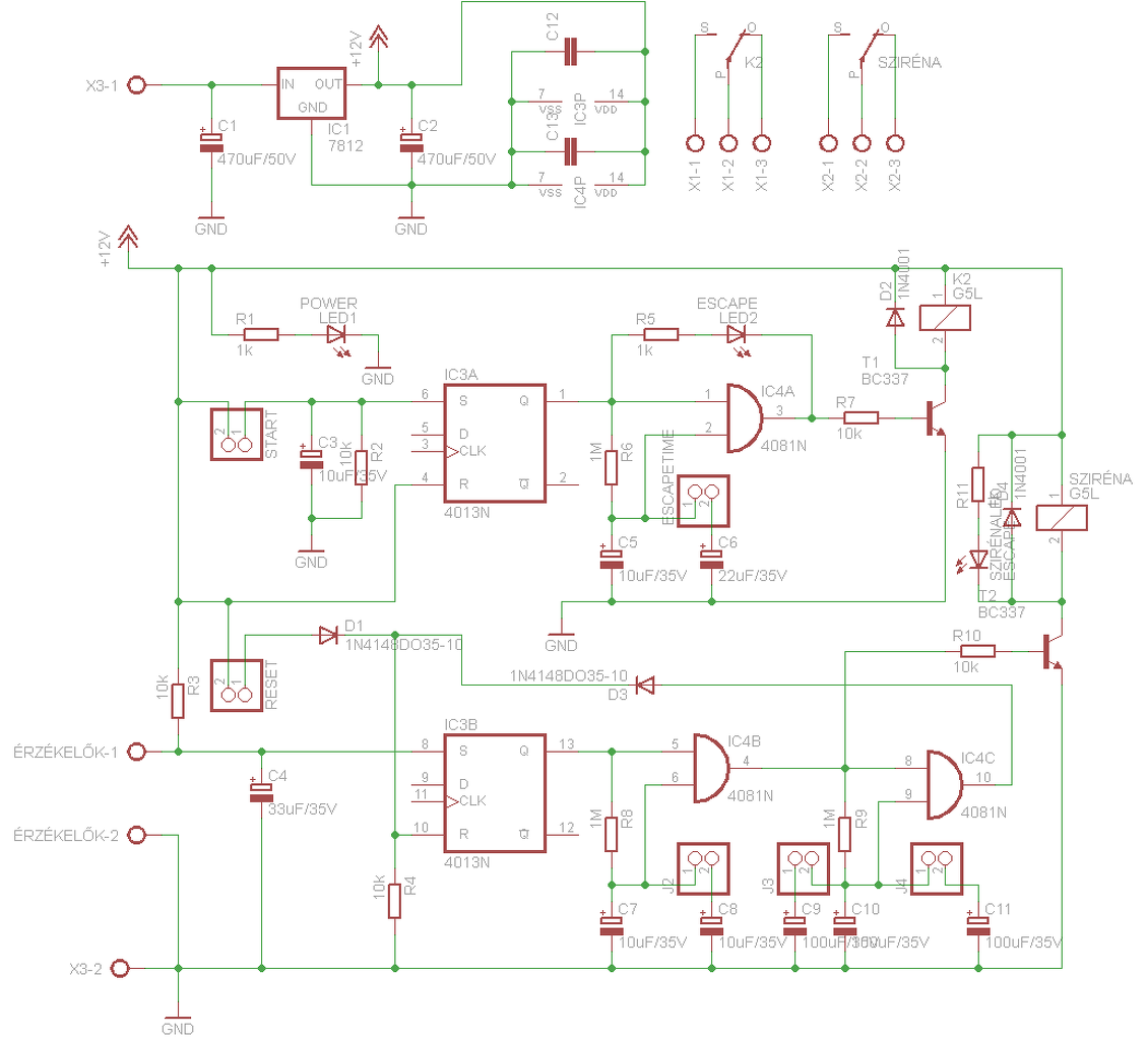 Ha már foglalkoztok vele, akkor a hibákat is el kellene hárítani. (Mert még tettél is hozzá..) - A riasztó bemenetén nem lehet a kontaktusokat párhuzamosan kötni. Mert a 4013-as tároló akkor billen be, ha Set bemenete magas szintre kerül. Itt meg az összes kontaktust bontani kellene, hogy ez teljesüljön. Vagy is csak bontó érintkezőkkel, és sorba kapcsolt kontaktusokkal működne. - A CMOS eszközök bemenetét nem lehet a "levegőben lógva" hagyni. A "nem használt" bemeneteket GND-re vagy tápra kell kötni. - Ugyan így a Reset nyomógomb után is egy 10k ellenállás kell a GND-re. (Itt az U3a Reset lábát nem a Reset gomb után,hanem közvetlen a tápra kötötted.) - Az "érzékelők-1" bemenet és a C4 közé, egy 1kohm körüli ellenállást illik tenni, mert a C4 kisütőárama, mikor záródik az utolsó kontaktus, szikrázni fog. És az ív, idővel felemésztheti a kontaktus anyagát. - A teljes táp stabilizálásától célszerűbb a reléket közvetlen 12V-ról járatni, és csak az áramkör részt stabilizálni. Ekkor az IC-k tápja lehet 6..9V és nem szükséges a bementi tápfeszültségnek 12V feletti értéket választani. (Hiszen várhatóan akkumulátoros megtáplálás kell..)