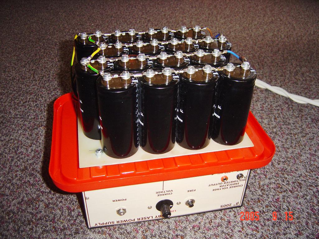 Nekem van egy futó projektem: rubinlézer építés, tisztelegve a kifejlesztő, Theodore Maiman emléke előtt. A belseje kicsit kaotikus, rádásul a működő verzióhoz egy korábbi változat nyákja lett átépítve, ezért van benne kevesebb alkatrész. De ami igazán látványos, az a kondenzátortelep, a harmadik képen.