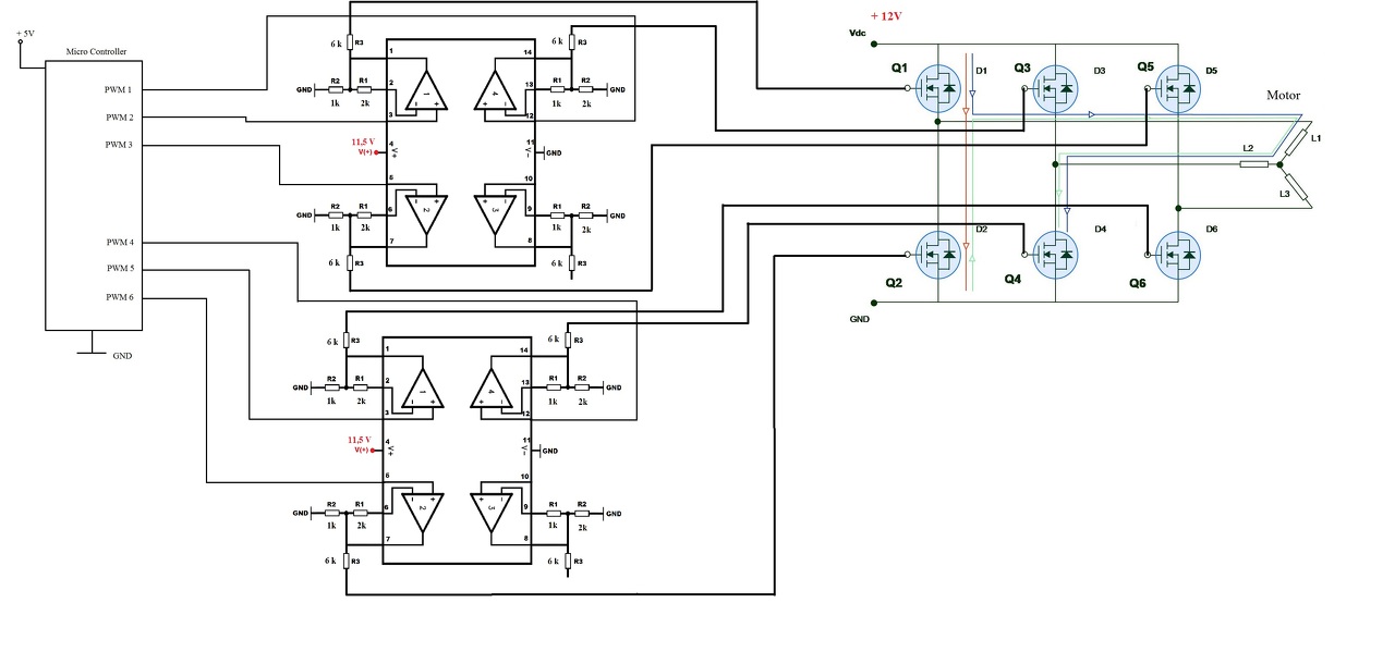 A kérdésem részben érinti a műveleti erősítőket, azt hiszem ebben a topicban lenne érdemes feltennem. Vezérlést készítek egy három fázisú kefe nélküli motorhoz, mosfet hidat, műveleti erősítőket és mikro kontrollert felhasználva. Képet mellékeltem. A műveleti erősítő a pwm jel erősítésére szolgál (nem invertált bemenetről vezérelve, negatív visszacsatolással beállított erősítés ezt az ábrán nem részleteztem). A problémám az, hogy mikor létrehozok egy állapotot pl. Q1, Q4 bekapcsolva (többi kikapcsolva) és megmérem az egyes fázisok feszültségeit érdekes dolgot kapok. Ugyanis minden fázisra ugyanannyi feszültség jut pl. 2V (fázis és GND között mérve természetesen). Ehelyett azt kéne kapnom, hogy a pozitívra kapcsolt fázis 2 V (L1), gnd-re kapcsolt fázis 0 V (L2), és végül az (L3) fázis a csillagpont feszültségén 1 V kellene lennie. A kapcsolásomban minden mosfet n csatornás, megoldás lenne e a problémámra, ha a felső mosfetket p csatornásra cserélném ? (kipróbáltam mosfet híd helyett, a kézi vezérlést azaz csak a motor és egy elem segítségével rákapcsoltam a feszültséget 2 fázisra, és multiméterrel megmértem az értékeket, akkor helyes értékeket kaptam az egyes fázisokon (+ feszültség, GND és csillagpont feszültségét is megkaptam), tehát mindenképpen valami a híd felépítésében okozhat gondot).