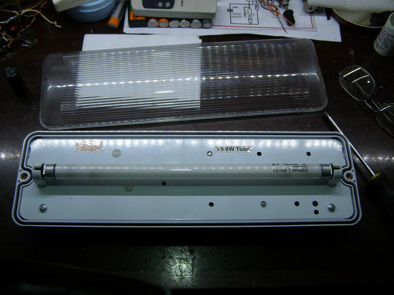 Én a vészvilágító házából a teljes vezérlő elektronikát kidobtam, és beleraktam a helyére egy rossz kompakt fénycső (ahol csak maga a cső a hibás, törött, kiégett, stb.) elektronikáját.