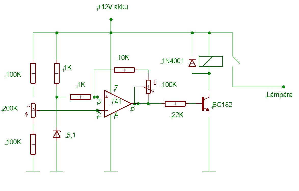 A 200Kohmos potival a kikapcsolási feszt tudod beállítani, a 100Kohmos potival a visszakapcsolási feszt (külömbséget) lehet beállítani. A 100K potira azért van szükség hogy ne kapcsoljon ki be amikor leesik a fesz.
