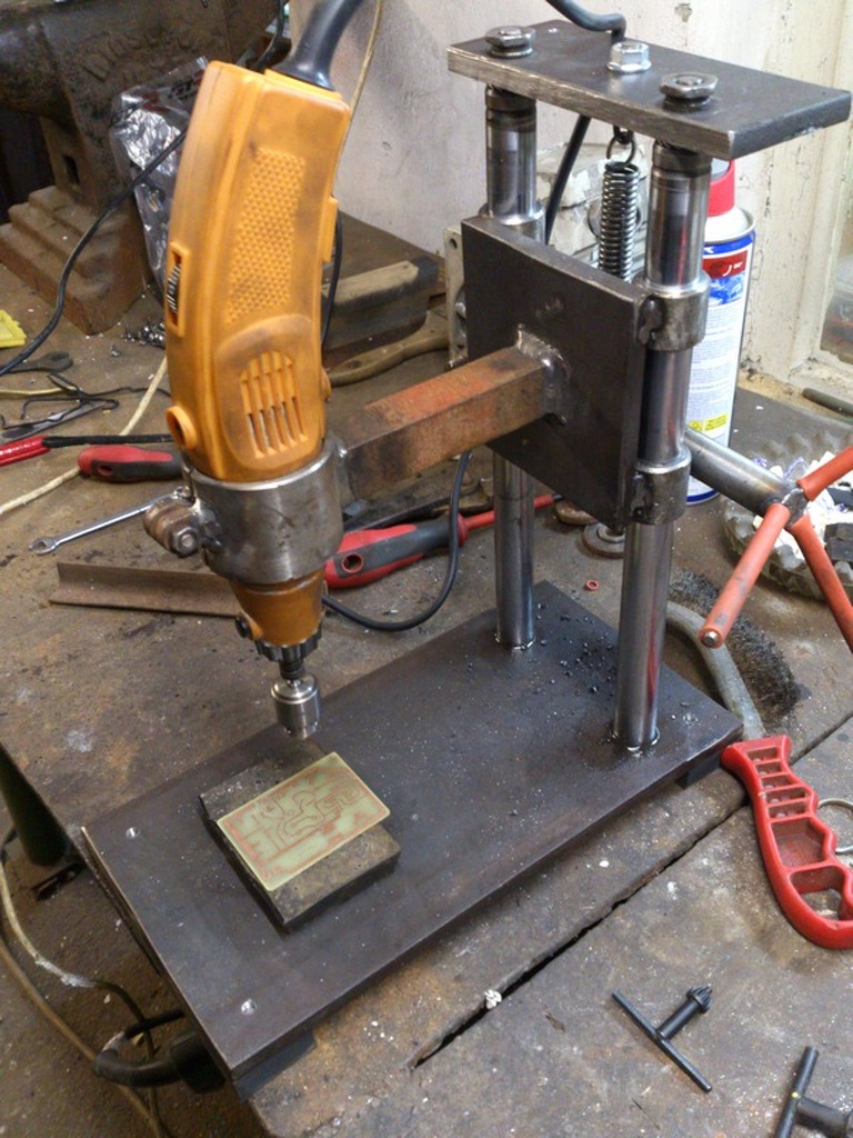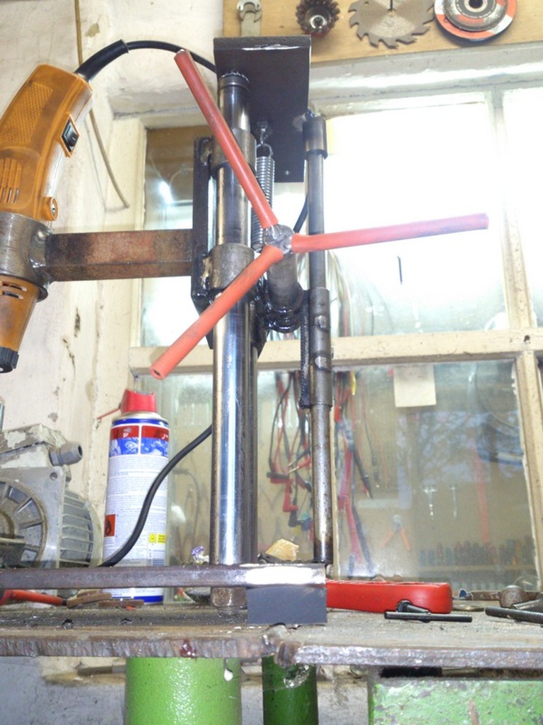 Nem az én érdemem, lévén amikor készült kb. 10 éves gyerek lehettem. Édesapám készítette és azóta is használjuk mindketten. A mozgató mechanika egyszerűsége miatt is mutattam meg. Nincs fogasléc fogasív, arányosan pontosan mozog. A felhasított tuskó kézikerekével ott rögzíted ahol akarod, akár beszerelés után is tudsz fúrkálni vele, mert sok minden aláfér.