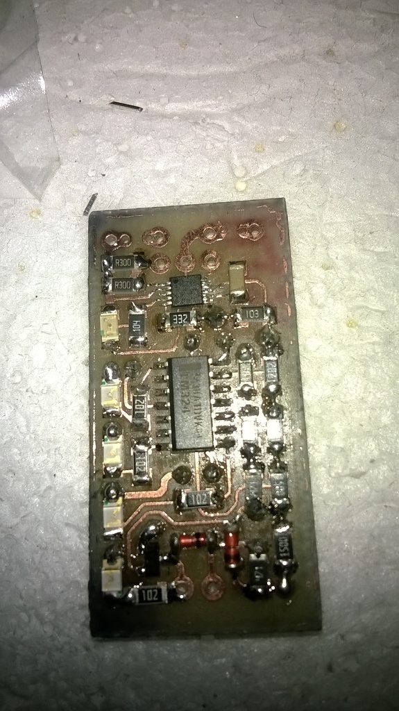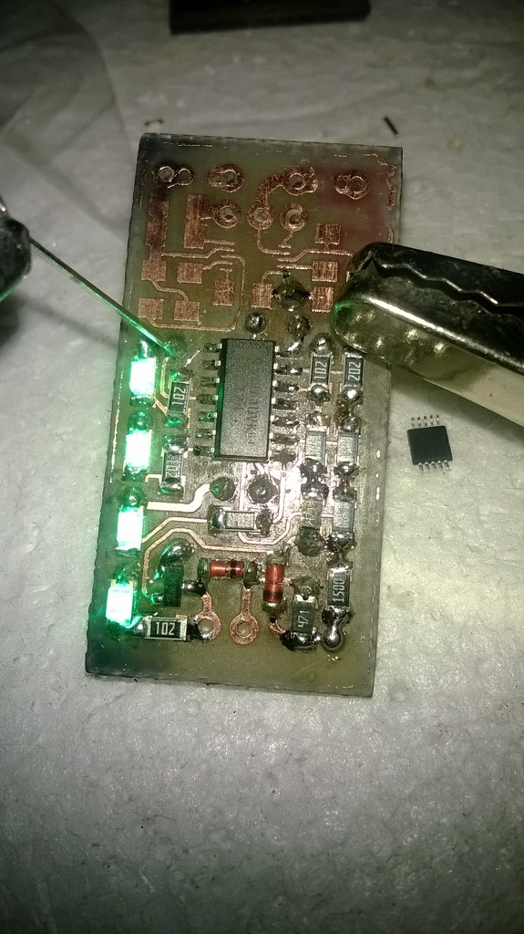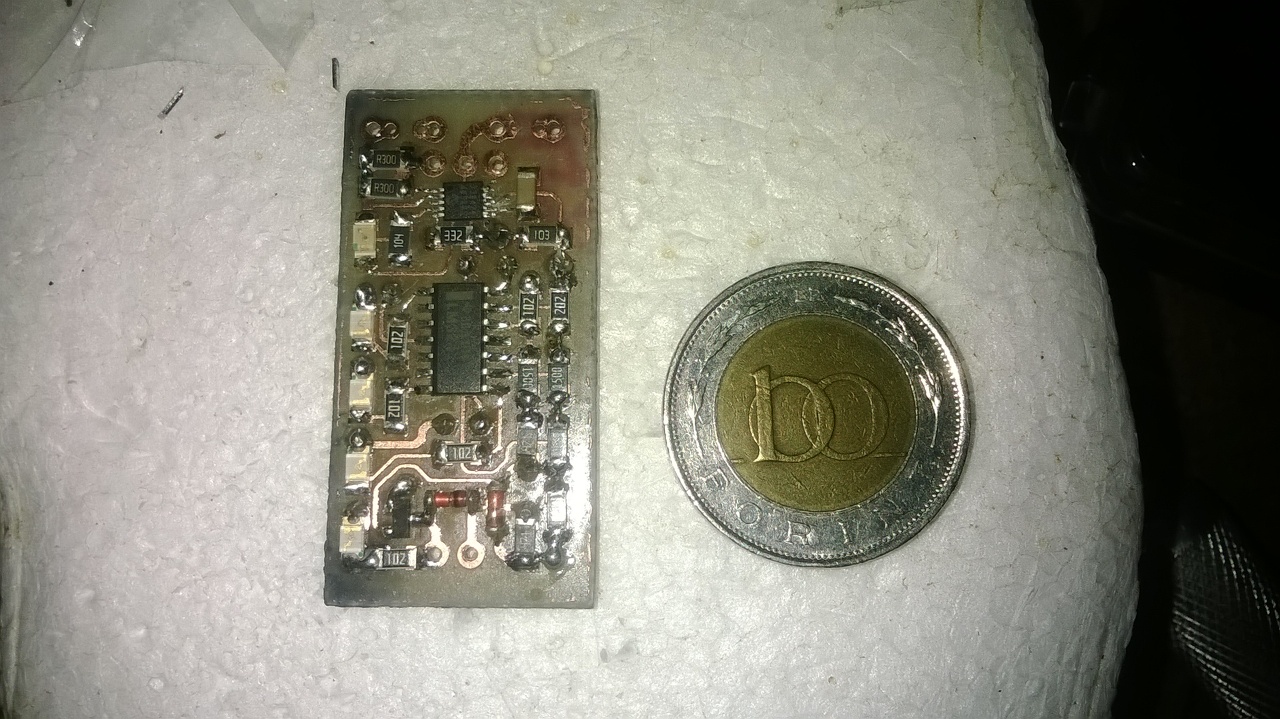 Elkészültem ennek a kapcsolásnak a lekicsinyített verziójával, de még ezen is sikerült volna kicsinyíteni, ha 0805-ös ellenállásokat, és LED-eket használok.