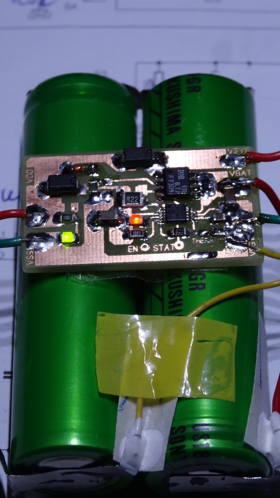 Ez egyébként 2db sorba kapcsolt Li-ion akkus LED-es lámpához lesz, és ha ez nem lenne elég , a kapcsolást még megfejeltem egy tranyóval, és egy relével, amolyan UVLO áramkört kiépítve, ami nem engedi az akkumulátort lemeríteni mélykisülésbe.