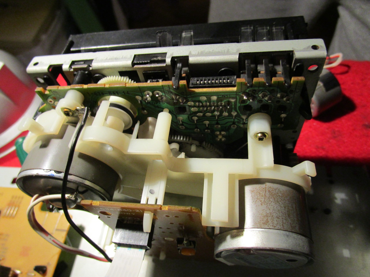 Valaki találkozott már a következő hibajelenséggel? Sony kétmotoros kazettás deck mechanika produkál olyan hibát, hogy amikor lejátszást megállítanám, a kikapcsolás közben a csévélőket hajtó motor - a rajta levő lengő fogaskeréken keresztül, lásd 3. kép - belekap a leeresztő orsóba, és előrepördíti a szalagot vele. Nem nagyon sokat, épp csak annyit, hogy ha utána megint indítanám, akkor mire megfeszítené a szalagot, már kikapcsol a szalagvégre figyelő automatika, mert nem érzékel forgást.