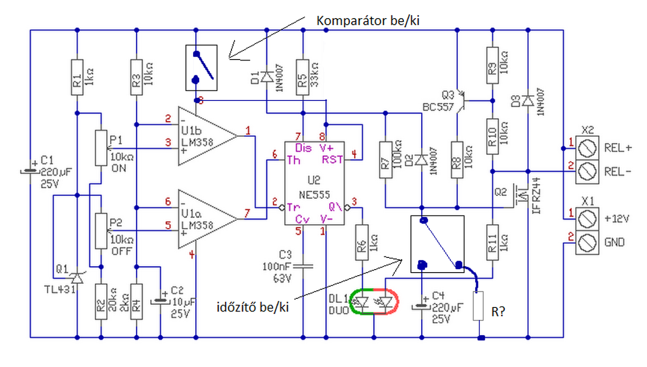 Sikerült megépítenem, frankón működik, még annyi hogy a c4 kondi az R7, R5 ellenálláson töltődik? Ha esetleg más időt szeretnék beállítani mint 10s akkor van e erre valami képlet, hogy hogyan tudom ezt kiszámolni. Közbe valaki kérte hogy csináljak neki egy ilyet, csak annyi változtatással hogy ki/be lehessen kapcsolgatni a komparátor és az időzítő részt is. Lerajzoltam hogy alakítanám át, működhet így a dolog? Ha igen, milyen értékűnek kell lennie a kérdőjeles ellenállásnak? Köszi. |