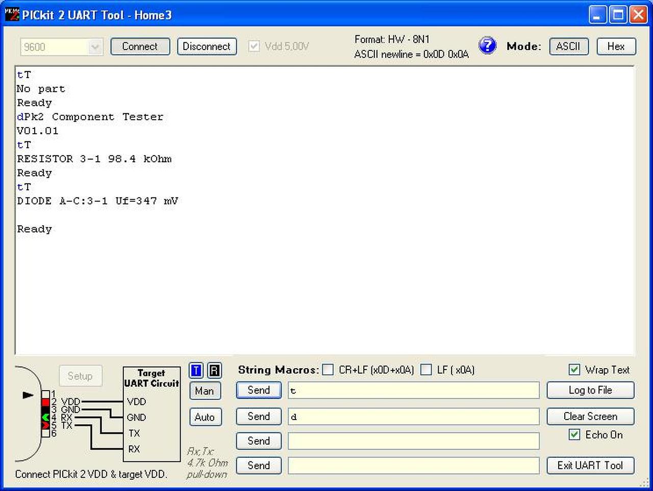 Vegyes az eredmény. Tápmérés jó. Sokkal lassabb a működés. A TL431 kimenetét földre zárja. A Schottky diódák mérése jó. Tranzisztorokat felismeri. A 4k7, 10 .. 12K körüli ellenállások mérése elfogadható ( multiméterrel 9.87k a műszer mindhárom lehetséges bekötésben 10.16k), de rosszabb, mint az ATmega8 -cal mért. 100k helyett továbbra is 81.15k. 470nF is jó a kondenzátor mérés (pl. a 22pF -ot nem méri), 470µF/25 V helyett 1180µF ESR 0 ohm. Quartz kicserélve, az eredmény ugyan az.