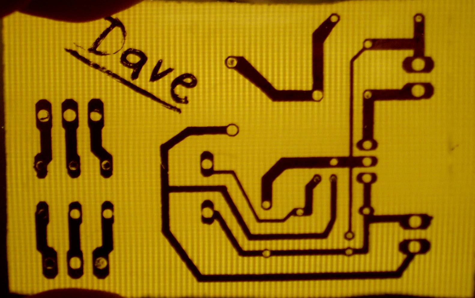 nah kimarattam a Frankye-féle mobilos relés kapcsoló nyákját. elsőre nem sikerült, valószínűleg túl sűrűre kevertem a lötyit (peroxidos maratót használok), de másodszorra már szépen beindult a maratás. a nevet (dave) kézzel írtam rá, meg filccel, de a filcből néhol az első maratás során leszedett, ezért lett ilyen - de azért olvasható. ez a második nyákom, a méretei: 6*4.5 cm. tudom ,hogy a két hosszabbik oldal vége kicsit görbe, de hát így sikerült, majd felsmirglizem holnap.