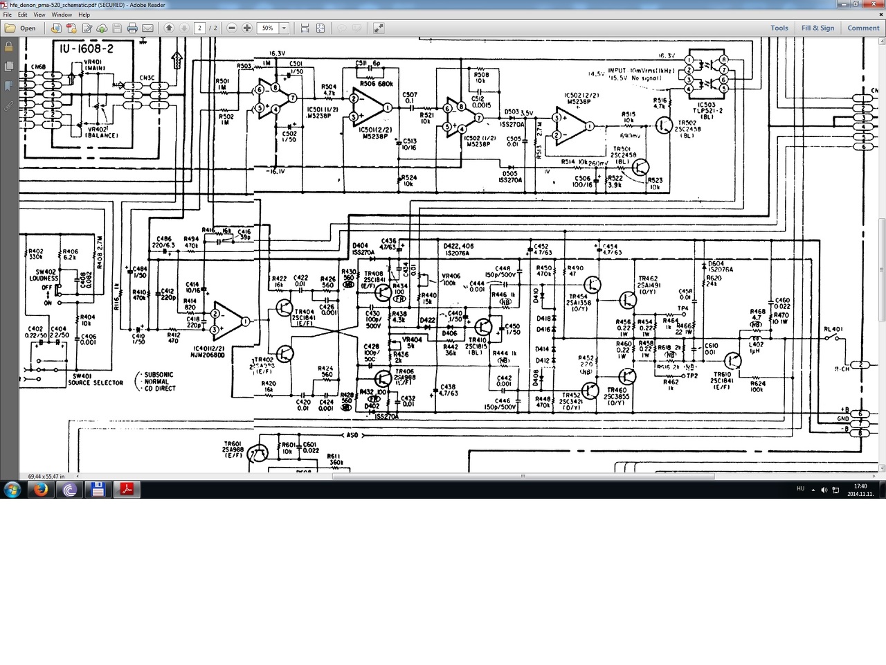 Szeretnék kérni egy kis segítséget. Javítok egy Denon PMA-520A típusú erősítőt,az egyik oldalnál mindkét végfok zárlatos volt,ezeket kivettem,majd egy-egy 100 Ohm-os ellenállást raktam BE lábak helyére.TR462 nyitófeszültsége 0,45V TR460 viszont 3.9-4V!!!. Primer körben 60W-os izzó van ami szinte teljesen kialszik. Meghajtók jók ezeket kiforrasztva is megnéztem. Emitter ellenállások,diódák,egyéb tranzisztorok jók a végfokban. Egy Optocsatolón keresztül vezérli a BIAS-t,ezt a részét nem egészen értem. Minden segítséget előre is köszönök!