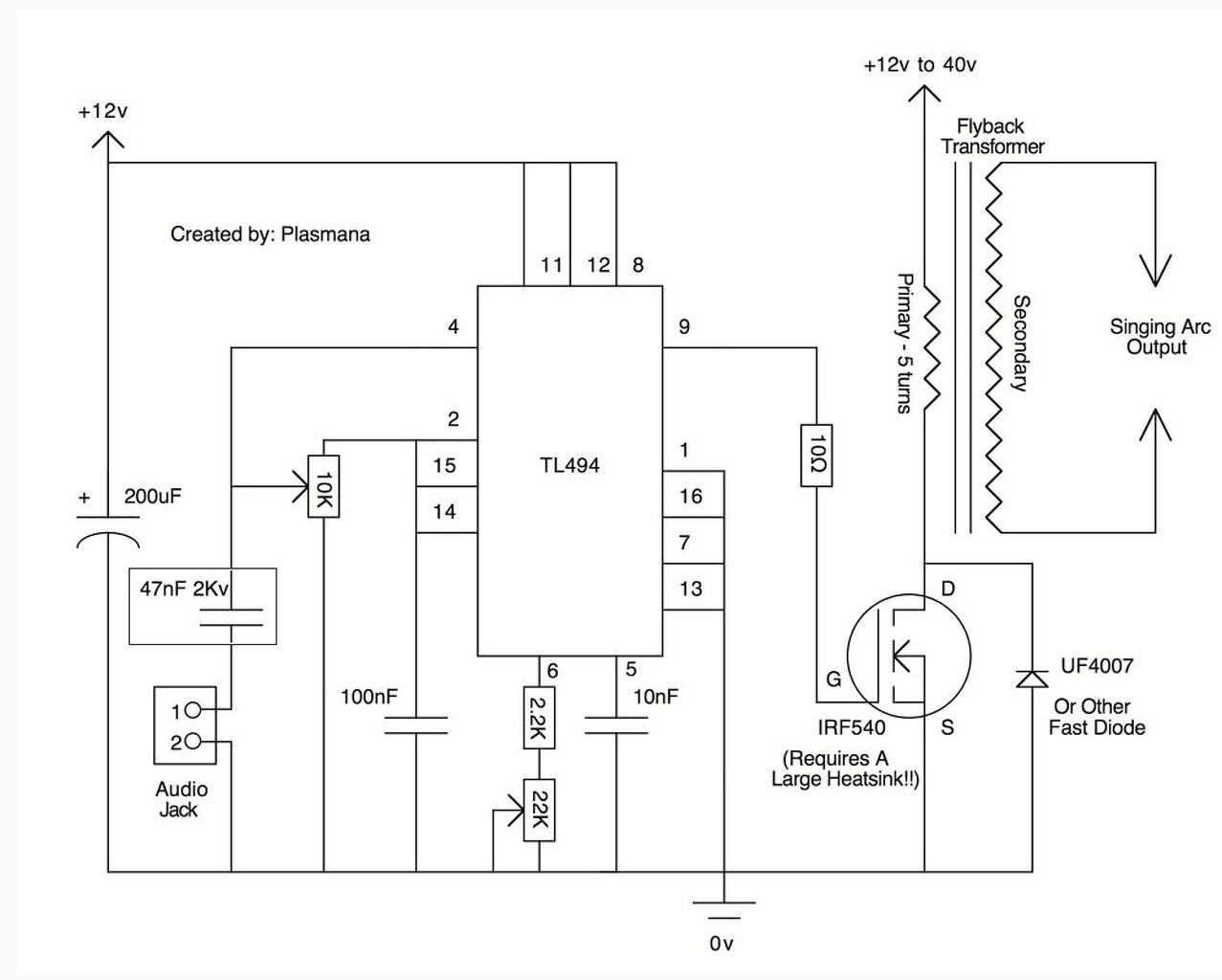 Annyi, hogy MOSFET-tel van meghajtva, az IRFP150N-es típussal. 12 voltról üzemel az egész áramkör. Plusz a kapcsolási rajzon a hang bemenetnél van egy módosítás, amivel sokkal szebb hangzás érhető el. Ami lényeg, és csak most tudtam le tesztelni: az IC 9es láb felől van egy kapcsoló, azt nem jó oda, és ugyan azon a vezetéken csak a 10ohmos ellenállás legyen ott, nem szabad onnan a 0-ára le ágaztatni. Menetszámok: mivel egyenárammal van meghajtva a rendszer, az önidnukció nagyon le terheli a tápot. Eddig ez miatt 1 PC tápom már leégett. 5 menetnél a védő dióda 12Vnál elkezdett füstölni, 4 menetnél jobban bírja a terhelést. Nálam 12 V-nál a sorkimenővel 20-30 ezer voltot tudtam elérni, ami egy 2-2,5 cm-es szikra közt tesz lehetővé. Nagyjából 4-4,5 A-es árammal. A sorkimenő GND lába lesz a sorkimenőből kijövő vastag vezeték másik oldala. A FET-nek meg célszerű aktív hűtést csinálni. A hozzászólás módosítva: Nov 9, 2014