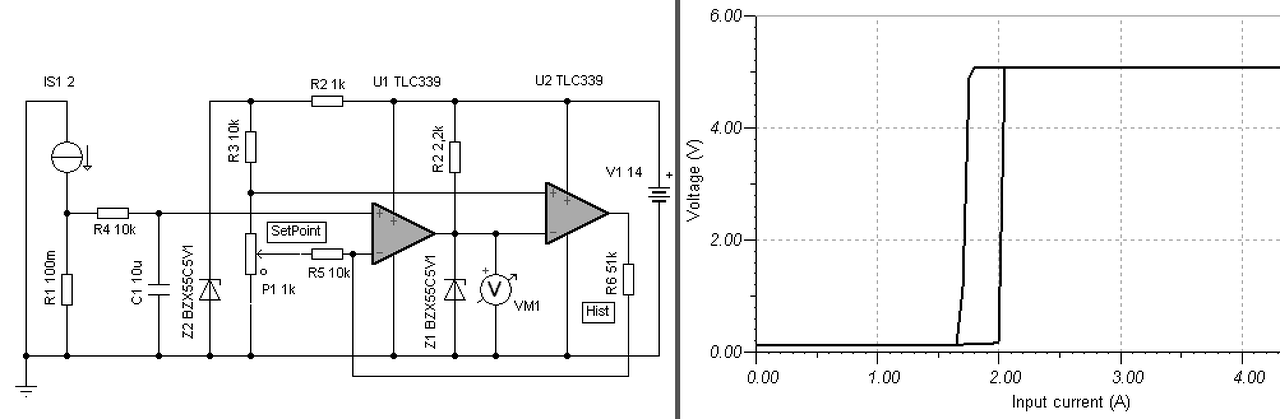 Azért az a tökéletestől messze van, mert a referencia kicsi, a dióda nyitófeszültsége aahoz képest nagy. Ha diódát használnál, akkor pld. a referenciát 0..5V-ig kell állítani, majd utána leosztani a kis értékre. Ennek a megoldásnak az a lényege, hogy a hiszterézis állítása nem befolyásolja a kapcsolási pont beállítását. (De nyitott kollektorral is precízebb, mert kb. 20mV-ra tud lemenni. De mindennek van következménye, előnye-hátránya..
