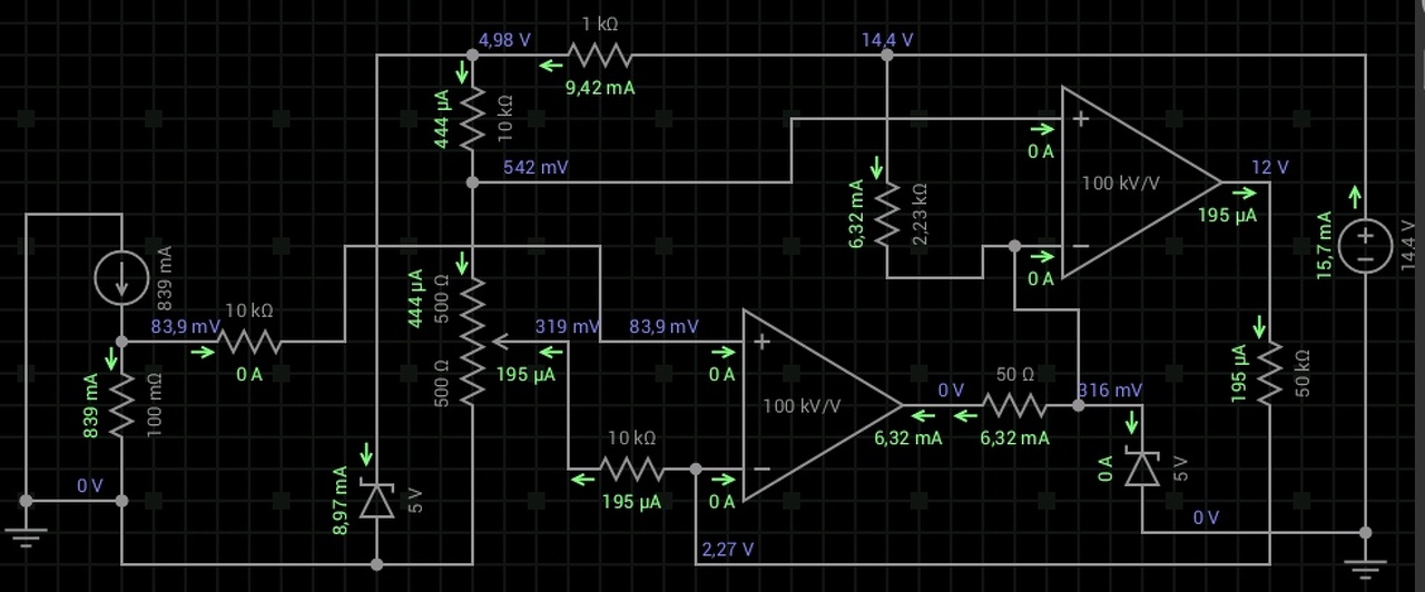 Az egészben az a szomorú, hogy a szimulátor nem látja a műveleti-erősítő terhelés hatására bekövetkező tápáramváltozását, tehát ezt a kapcsolást nem lehet Tinával modellezni, legalábbis nekem eddig nem sikerült
