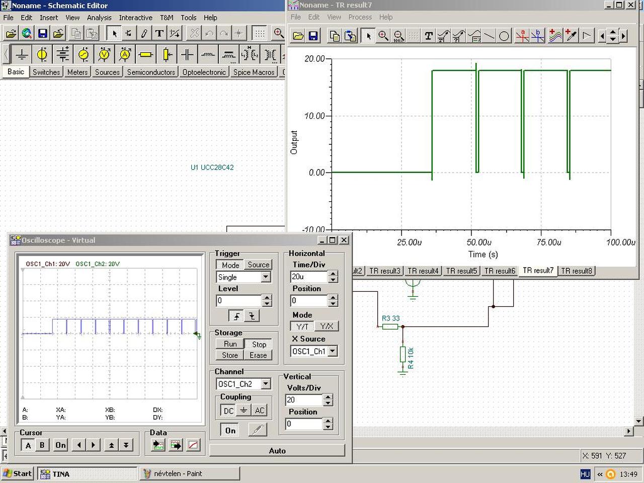 - Frekvenciának csak a periódikus jeleknél van értelme, avagy a jel "elejét" nem lehet figyelembe venni. - A tranziens analízis mutatja az időt, és a feszültséget. A szkóp pedig Time/div és Volt/div értékben van kalibrálva. Vagy is a 20us és a 20V a szkópábra egy kockájára vonatkozik. Nem amit a teljes képernyőn látsz! De még mindig nem használod a markereket, pedig úgy a grafikonnál, mint a szkópnál ott látható A és B megjelöléssel és dx és dy értéket is kiírja..