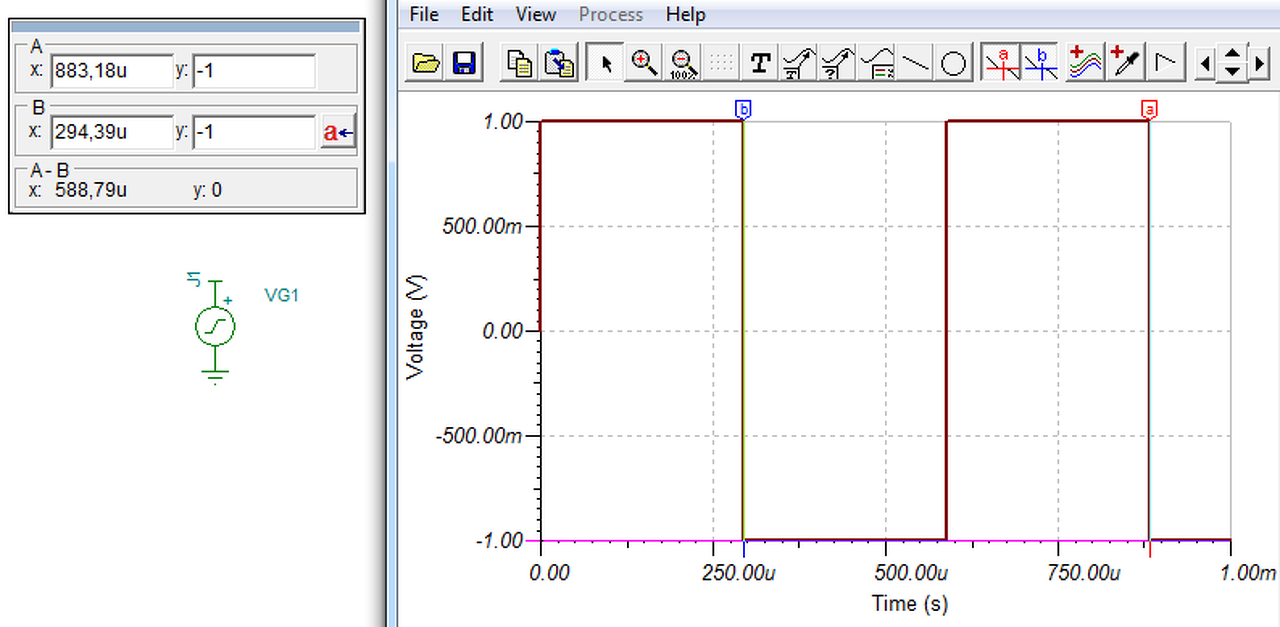 A tranziens analízis párbeszédablakában be tudod állítani az analízis hosszát. 1 millisecundummal (1m) szemlétesebb eredményt kaptál volna. A markert Gábor már említette.