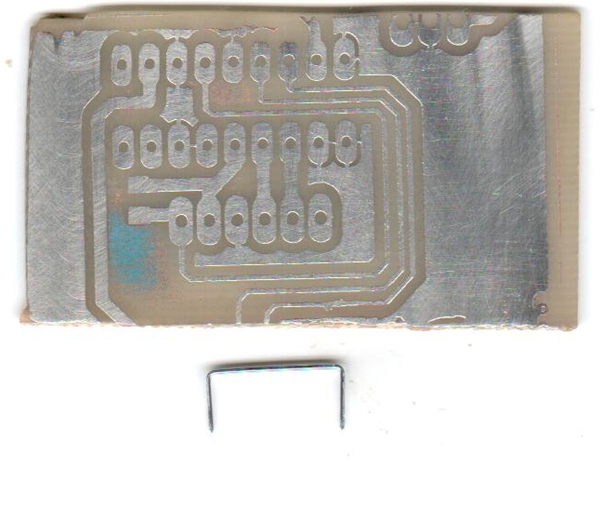 Sziasztok. Ha már a maratásnál tartunk, akkor egy újabb módszer a nátrium kloritos maratás. Mivel beindult a postai csomagszállítás a www.pgchem.sk/ -től, így rendeltem tőluk 1kg. A tapasztalat: nyáklemez telibe galvánónozva, dry fólia, nyomdai pozitív levilágító filmel levilágítva. Majd szemre egy kis folyékony nátrium klorit és háztartási szalmiákszesz ( több szalmiák ) összekeverve. Mindezt a hideg garázsban, a nyáklemezt beletéve - elég büdös - a folyadék sötétkék színűre szineződött és kb. 1 óra alatt lemarta a kis darab lemezt. Se melegítve sem pedig kevergetve nem volt. A nyákon az a kis zöldes folt még a réz ( türelmetlen voltam ).