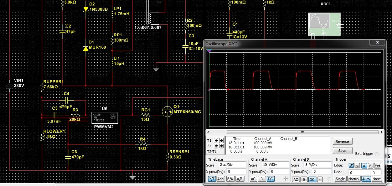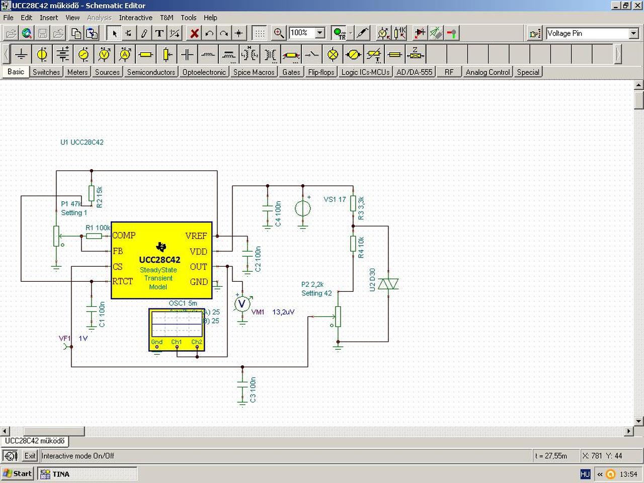 Pl. a 13-as multisimben is vannak UC-k, 42, 44, 45 stb. de nekem egyik sem ment. Viszont a szimulációk között van egy flyback szimuláció, amiben csináltak egy ezekhez hasonló vezérlőt, és az megy. A szkóp a gate jel.