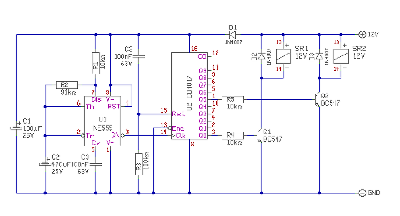 Az időzítést az R2-C2-vel lehet változtatni. De a 4017 minden Q kimenetének magas szintje egyforma hosszú. (Az R3-C3 a 4017 Reset jelét adja. Ez állítja a számlálót Q0-ára, hogy bekapcsoláskor mindig az SR1 bekapcsolásával kezdődjön a "program".)