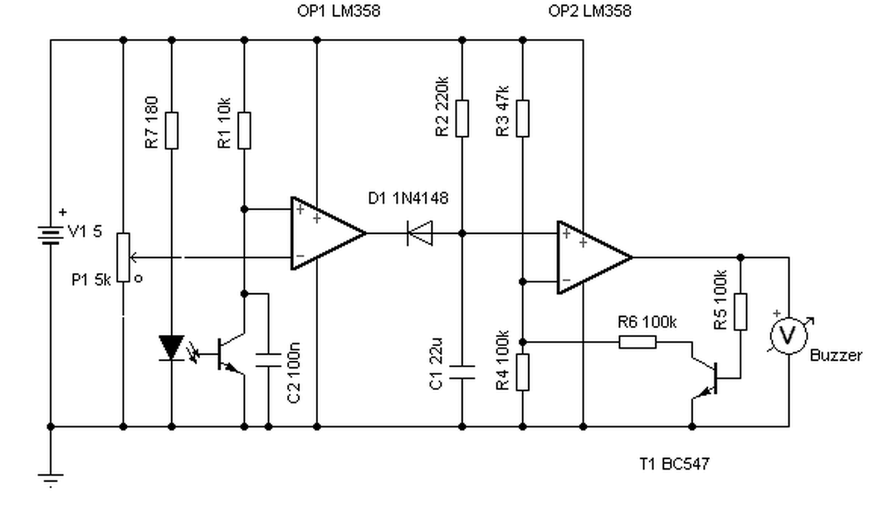 A buzzer az 555 ic kimenet és a plusz közt van de folyamatosan sipol és csak akkor hallgat el ha az infra vevő jelet kap az adótól. A síp akkor kellene amikor a vevő jelet kap az adótól. Szóval , az LM358 kimenetén folyamatos pozitív fesz van (tehát a led sem világít) és akkor vált nevatívra ha az infra vevő jelet kap az adótól és a led világít is. Namost ez az LM358 kimenet ugyebár alaphelyzetben pozitív és ezt kapcsoltam az 555 áramkör bementére, a BC 857 tranyóra. Amíg a pozitív jel megy a BC-nek, addig az 555 kimenetén a buzzer sípol.Ha negatívot kap a BC, akkor a buzzer elhallgat. Ha újra pozitív megy rá, 5s-el később sípol újra (a 10µF kondi miatt). Ez pont a fordítottja annak, amit el akarok érni de a buzzer a kimenet és a negatív között nem jó mert akkor a sípolás a jel megszünése után 5s-ig tartana nekem pedig a jel megjelenése után 5s-el kellene elkezdenie. Csak akkor működne jól az egész ha az LM358 alaphelyzetben negatívot adna ki és akkor váltana pozitívra ha az infra vevő jelet kapna az adótól. Lehetséges megfordítani az LM kimeneti jelét?