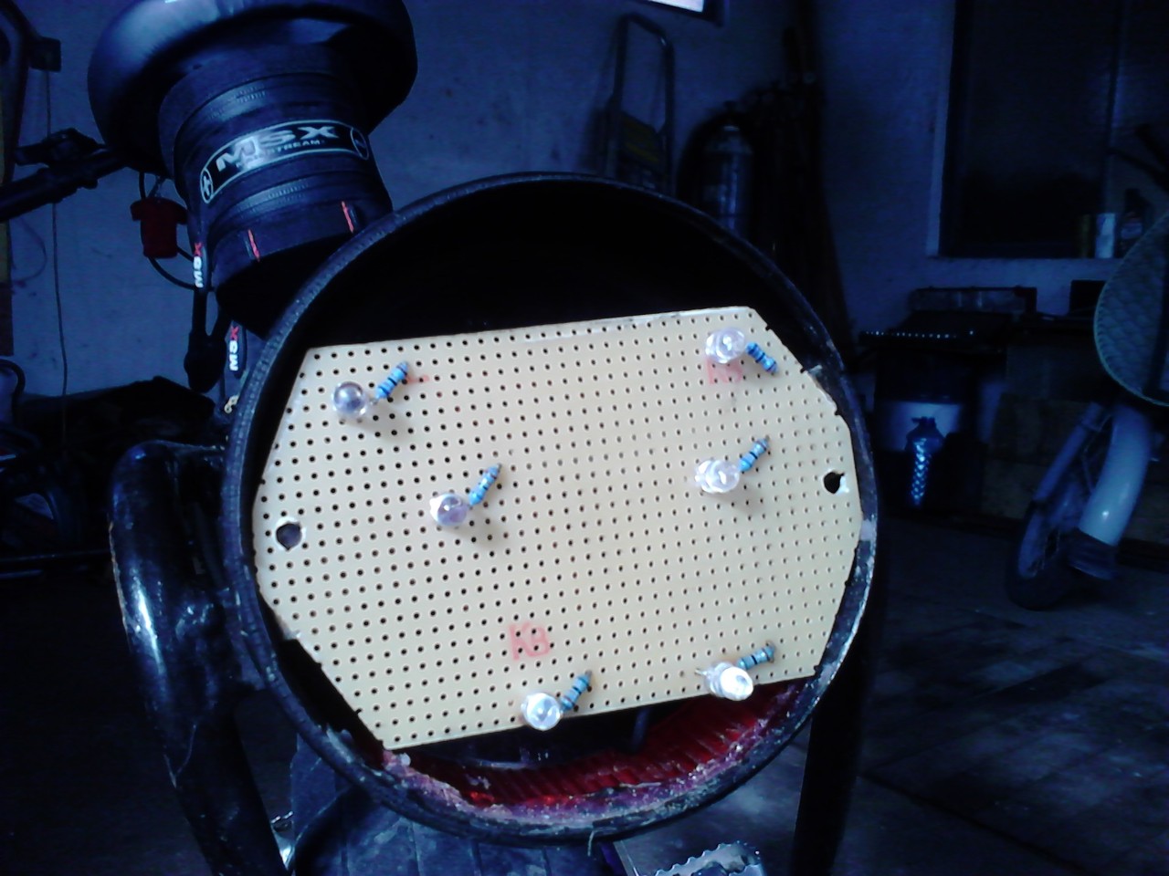 Bicikli. Elől 3w power led, van hozzá áramgenerátor (olyan, amit az elemlámpákban is használnak 3,7V), hátul pedig 6 db extra erős 5mm piros led ellenállásokkal, 3,7V-al kiszámolva.
