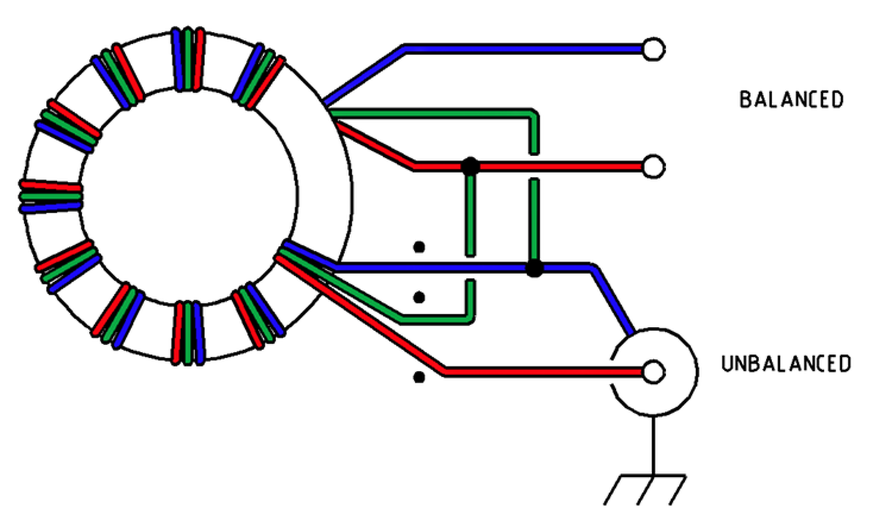 Az 1:1 Balun bekötése toroid kivitelben.