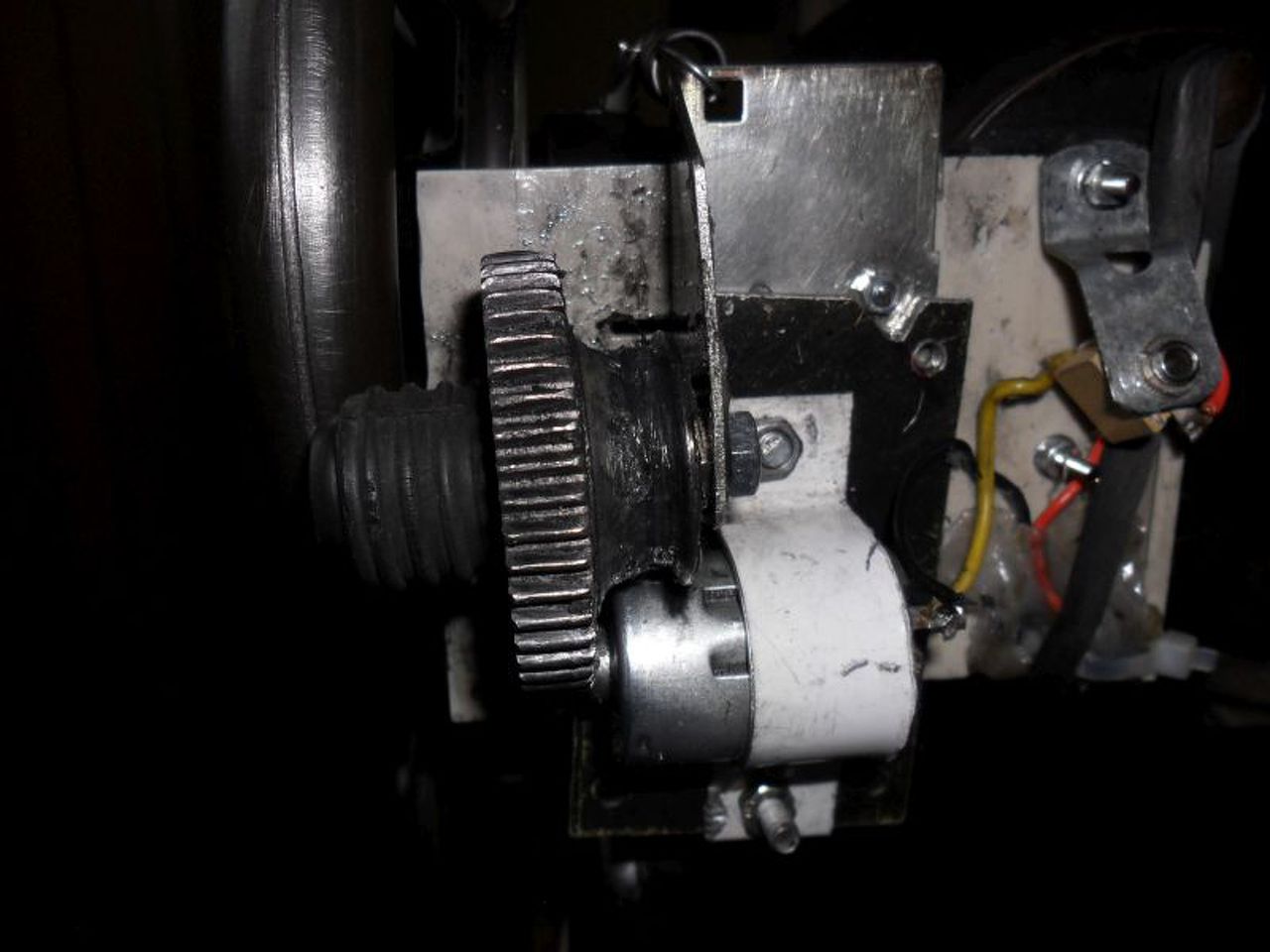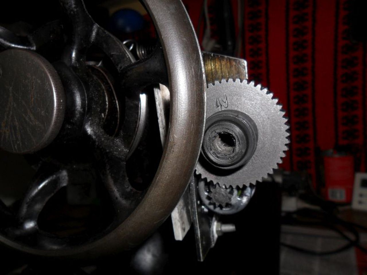 Sziasztok! Befejeztem a Singer varrógép átalakítást. Remélem, most már végleges. Nagyon sok munka volt vele, ezúttal közlök áttétel adatokat is, hátha még valaki megpróbálkozik ilyesmivel, tudja hányszoros fordulatszám csökkentés kell. A motoron levő kis fogaskerék átmérője: 11 mm, a nagy fogaskeréké 49 mm, a gumi dörzskerék 20 mm, a varrógép öntöttvas kereke 152 mm átmérőjű. Ez összesen 1:35 áttételi arányt jelent, belátható, hogy az eredeti ékszíjtárcsa csak az esetben használható fel, ha a motor fordulatszáma jóval ezer alatt van. A törpe feszültségű motorhoz most már ragaszkodom, mert kicsi, nem kell foglakozni az érintésvédelemmel, és elég jó a nyomatéka 5000 körüli fordulatszámon 6 Voltról 5 Amper körül vesz fel. Kicsit növelve a tápfeszt, 9 Volt tájékán 10 A forog már olyan gyorsan, mint pedállal lehetett felpörgetni. Az akkus csavarbehajtó eredeti áttétele csapágyazás híján megszorult, és elkoptak a fogaskerekek. Én a nagy fogaskereket találtam a fiókban, a kicsit én alkottam egy 2x ennyi, fele ekkora fogú kerék minden második fogát vágókoronggal kivágtam (Eredetileg egy SCSI Winchester motorján volt). Találtam egy 8 mm belső átmérőjű golyós csapágyat, melynek a közepét csavarral rögzítettem, kívülre a csavarbehajtó műanyag szára rögzül 3 db csavarral, és műgyantával. A dörzskerék gumija valamilyen koax antenna csatlakozó porvédő gumija volt, bármilyen kb 20 mm külméretű gumicső darab megfelel. A pedál a képen látható kínai mini varrógép pedálja, egyelőre csak egy pár érintkezőt tartalmaz még gondolkozom rajta, érdemes- e tovább bonyolítani, hiszen a tápegységen bármikor gázt adhatok neki, sőt az áramkorlát segítségével lágy indítás is lehetséges.