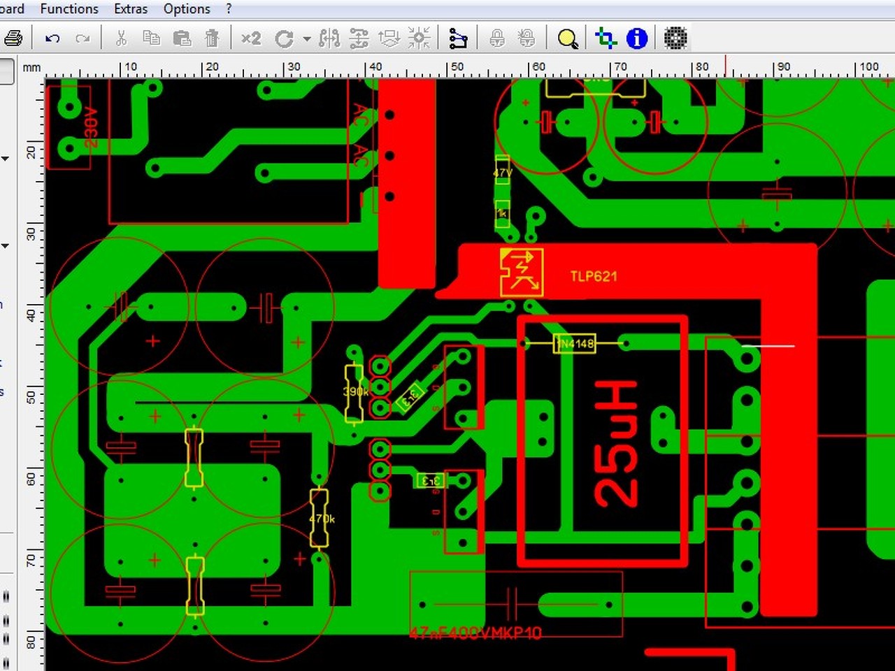Az érdekesség, hogy a másik panelen is ugyan ez az elrendezés volt, és mégis ment. Annyira nem különbözik szerintem. Ez itt a régi verzió, ami működött. A vezérlő sorcsatlakozóval kapcsolódik be a főpanelba, ennek a lábainak is lehet plusz ellenállása, viszont ez az előzőn is megvolt. A vezérlő ic-nek 18V a max tápja, és ennyiről megy. De erre még rámérek, hogy mire eljut a lábhoz, nem lesz-e kevesebb. A 25 uH-s tekercs végül nem került fel, ezért az új panelre nem is terveztem rá.