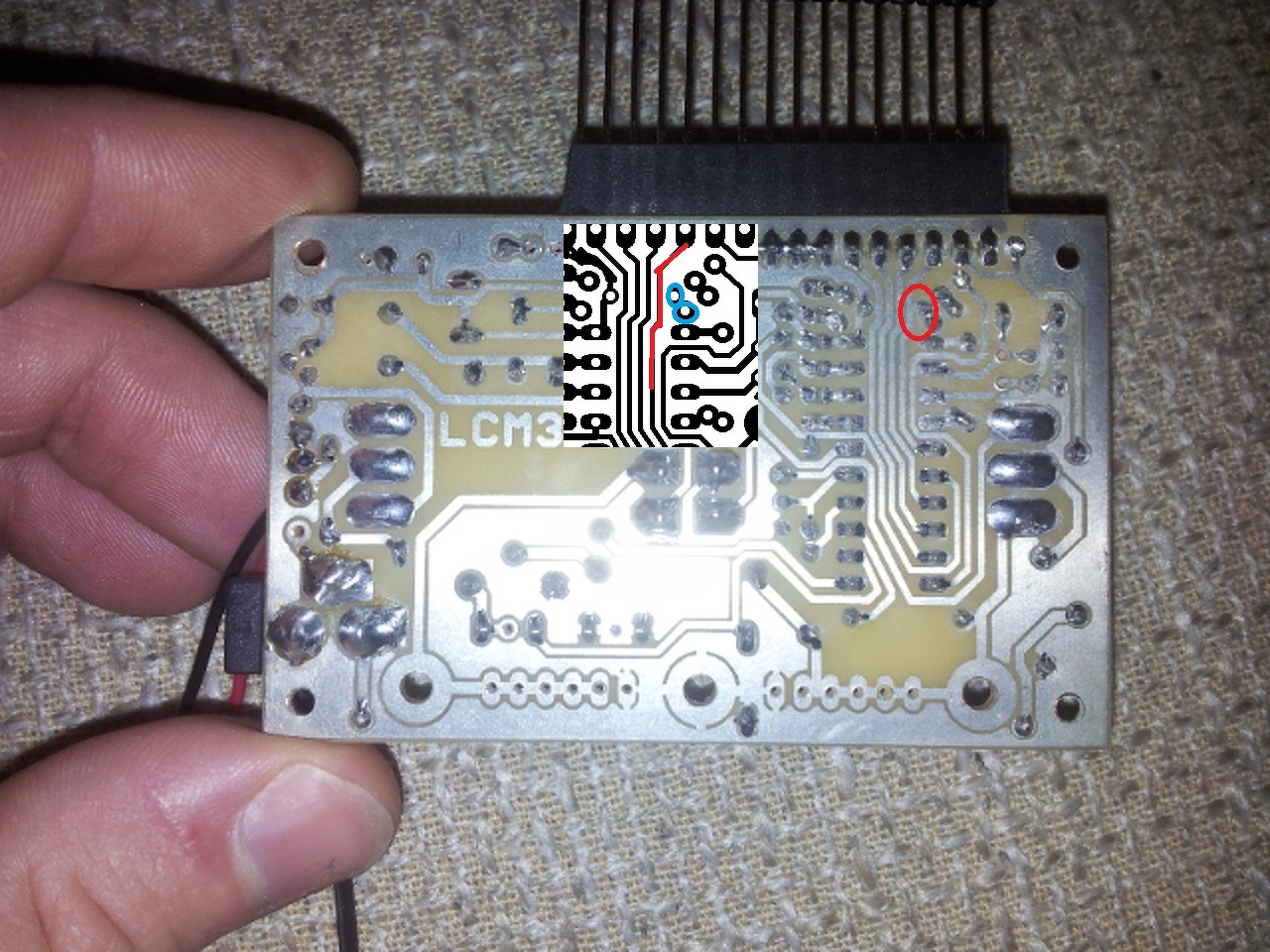 Másrészt ne vagdos el találomra semmit! Lehet hogy arra akartak utalni hogy a kékkel jelzet forrszemek és a pirossal jelzett vezeték összeér a hibás maratás miatt -ez a képen rosszul látszik-. Ha így van az az összekötést kell elvágni. |