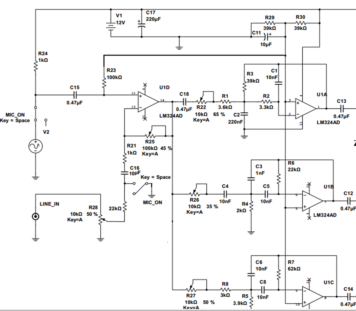 A lényeg U1D egy mikrofonos erősítőt alkot, U1A egy alul áteresztő kapcsolást 10x fesz. erősítéssel, U1B egy felül áteresztő szintén 10x, U1C egy sáv-áteresztő.