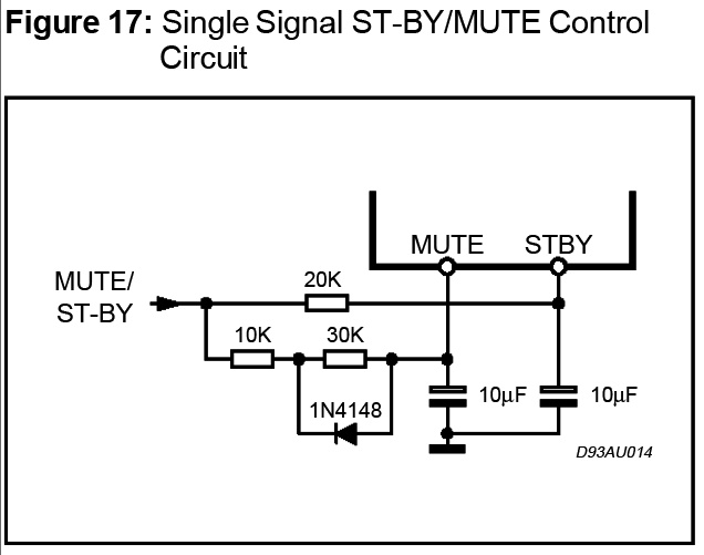A csatolmányban szereplő kapcsolással megoldható a koppanásgátlás, már ha van... mikor bekapcsolod, akkor először a STBY kapja meg a tápfeszt, és utána kis idővel pedig a MUTE láb. kikapcsoláskor pedig pont fordítva történik, a dióda segítségével. Előbb MUTE, aztán STBY.