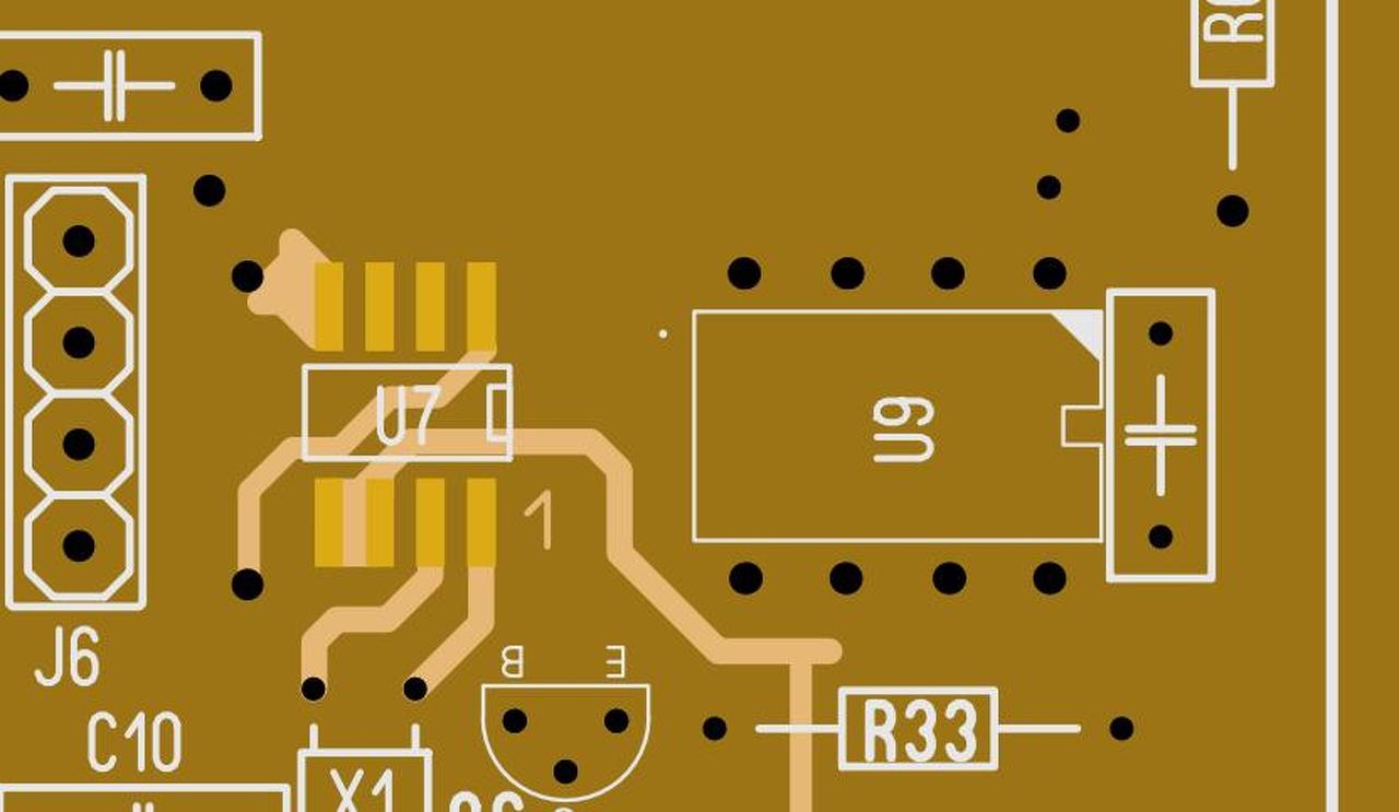 Ha a kék vezeték rétegre kapcslódnak a kivezetései, akkor az SMD tok is a nyák alkatrész oldalára került. Az 1. lába arra van, amerre az U9 -é. Jelölve és a funkcióját tekintve a tok tükrözve van. Photoview.